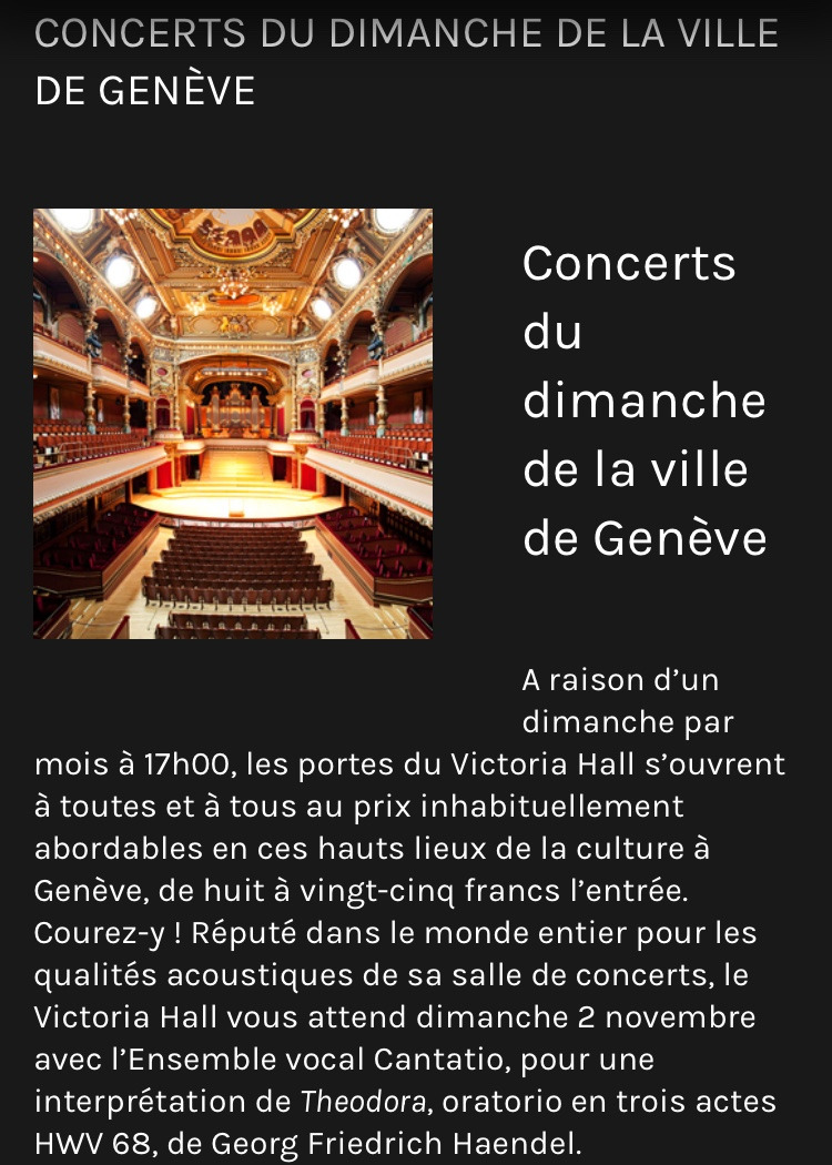 어렵게 구한 국제기구 인턴십을 힘겹게 따라가고 있는 와중이었다. 그 상황에서도 조금 숨 쉴 틈이 생겼다. 왜냐, 제네바의 겨울에는 명백한 즐거움이 있었다. 그것은 바로 디망쉬 콘서트. 연회장처럼 멋들어진 건축물과 탄성이 쏟아질 법한 화려한 샹들리에가 가득한 음악당 빅토리아홀에서 매주 일요일마다 연주하는 주말 콘서트이다. 제네바시에서 주관을 하고 후원까지 하는 이 클래식 공연 시리즈는 4달에 걸쳐 매주 일요일 오후에 연주를 하는데, 프로그램이 때로는 오르간, 때로는 오케스트라, 때로는 성악이었다. 겨울이면 내가 불과 25프랑에 로얄석을 차지할 수 있는 귀한 기회였다. 정규 프로그램에서는 5배 가격쯤으로 겨우 구할 수 있는 티켓이다. 능력치가 높은 동료들과 함께 인턴십을 하며 열등감과 자격지심으로 부대끼고 마음고생을 하고 있는 중, 음악은 내가 유일하게 저속 충전을 할 수 있는 장치였다. 제일 좋은 자리에서 음악회를 관람하려니 세상의 모든 것이 별안간 훌륭해 보였다. 곧이어 음악이 창조하는 신묘한 세계로 빨려들어갔다.
