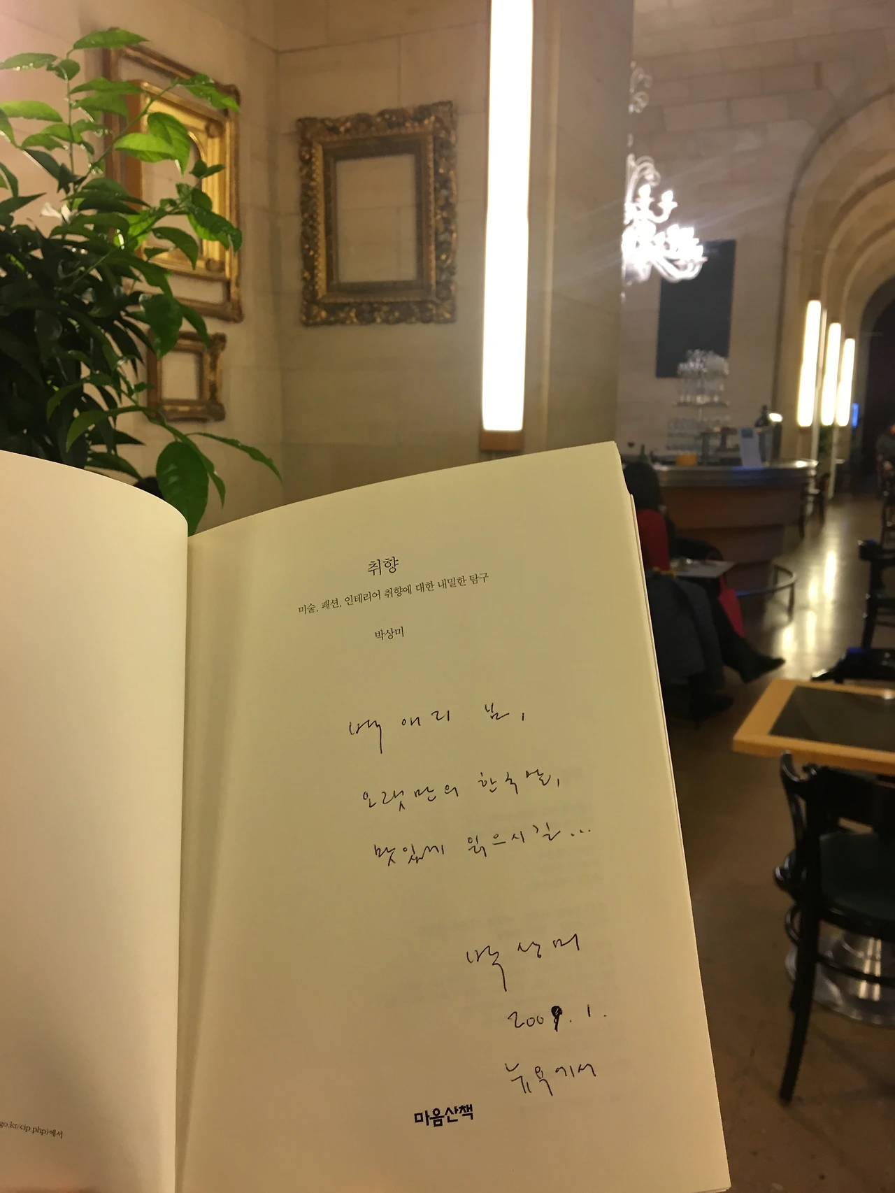 곧이어 어느날, 나는 기숙사 주소로 보내진 뉴욕발 소포를 받는다. 뉴욕에서 가깝게 지낸 박상미 작가의 신간이었다. 책의 제목은 <취향>, 뒷표지에는 이렇게 적혀 있었다. '아름다운 취향은 어디서 오는가. 느끼고 배우지 않는 인간을 상상할 수 없듯이, 미적 경험과 교육으로 연마되지 않은 취향이란 없다!' 정말 근사했다. 나에게 에드워드 호퍼를 알려준 작가, 미술을 소개해 준 한 아름다운 인물이다. 박상미 작가가 여기서 말하듯 '미적 경험과 교육으로 연마'하는 과정 중 나는 우연히 나의 comfort zone을 찾아낸 것 같다. 무럭무럭 자라난 '취향'은 덤이다.