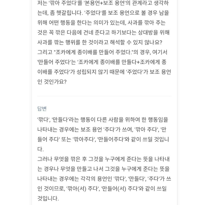 글을 이렇게 길게 쓸 생각이 없었는데 어쩌다 보니 길어졌다. 본래는 '만들어주다'의 띄어쓰기를 확인하고 느낀 점을 쓰려 했다. 이제 와서 이야기하자면, '만들어주다'와 '만들어 주다'의 의미가 조금 다르다고 한다. (글이 너무 길어지니 설명은 위 사진으로 대체한다.)