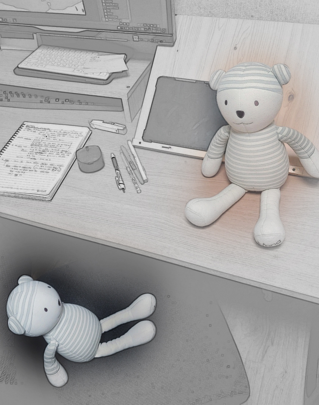 6살 꼼이가 어린이집에 가며 자신의 분신과도 같은 인형 두 개를 내 책상과 의자에 앉혀놓고 갔다. 바로 옆에 자기 책상과 의자도 있는데 둘 다 엄마의 영역에 놓고 간 것을 보니 마음이 짠하다. 어린이집에 가기 싫은 꼼이야, 가기 싫다고 말해도 가야 한다는 걸 이제는 아는 꼼이야, 계속 계속 엄마 옆에 있고 싶은 꼼이야. 이토록 사랑스러운 널 어쩌면 좋을까. 하지만 미안하게도 네가 없는 집에서의 시간은 너무 빨리 가. 심지어 여러 날 네가 어린이집에서 더 늦게 오기를 바라기도 해.