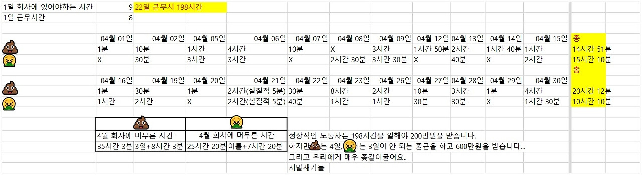 하도 출근을 안 하길래 실 근무시간을 기록해봤다