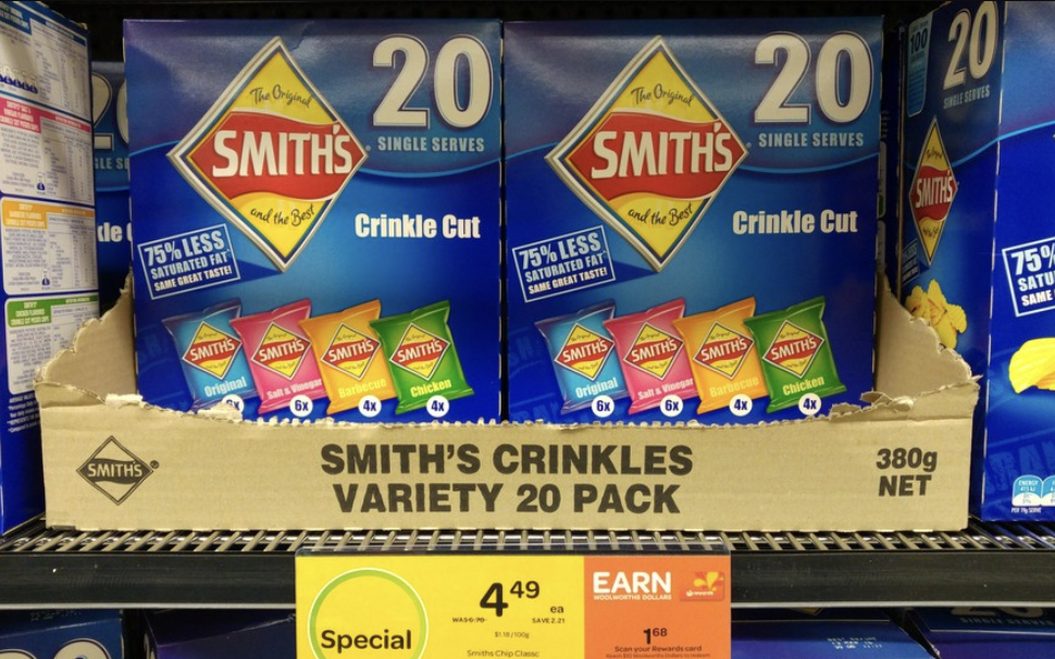 포테이토칩, 호주 국민과자다. 맛은 오리지널, 치킨, 바비큐, 치즈엔 어니언 등이 있으며, 맥주 안주로 사랑받는 스미스 칩이다.