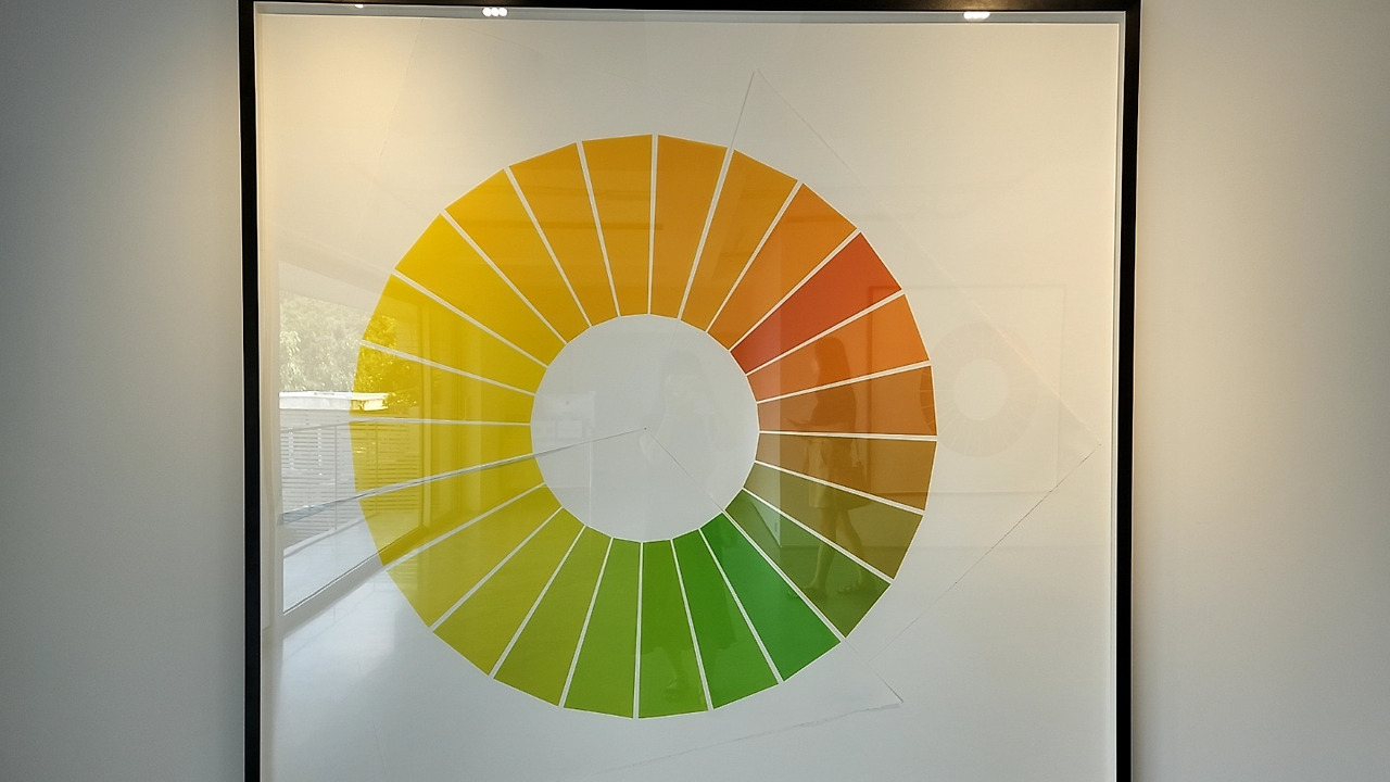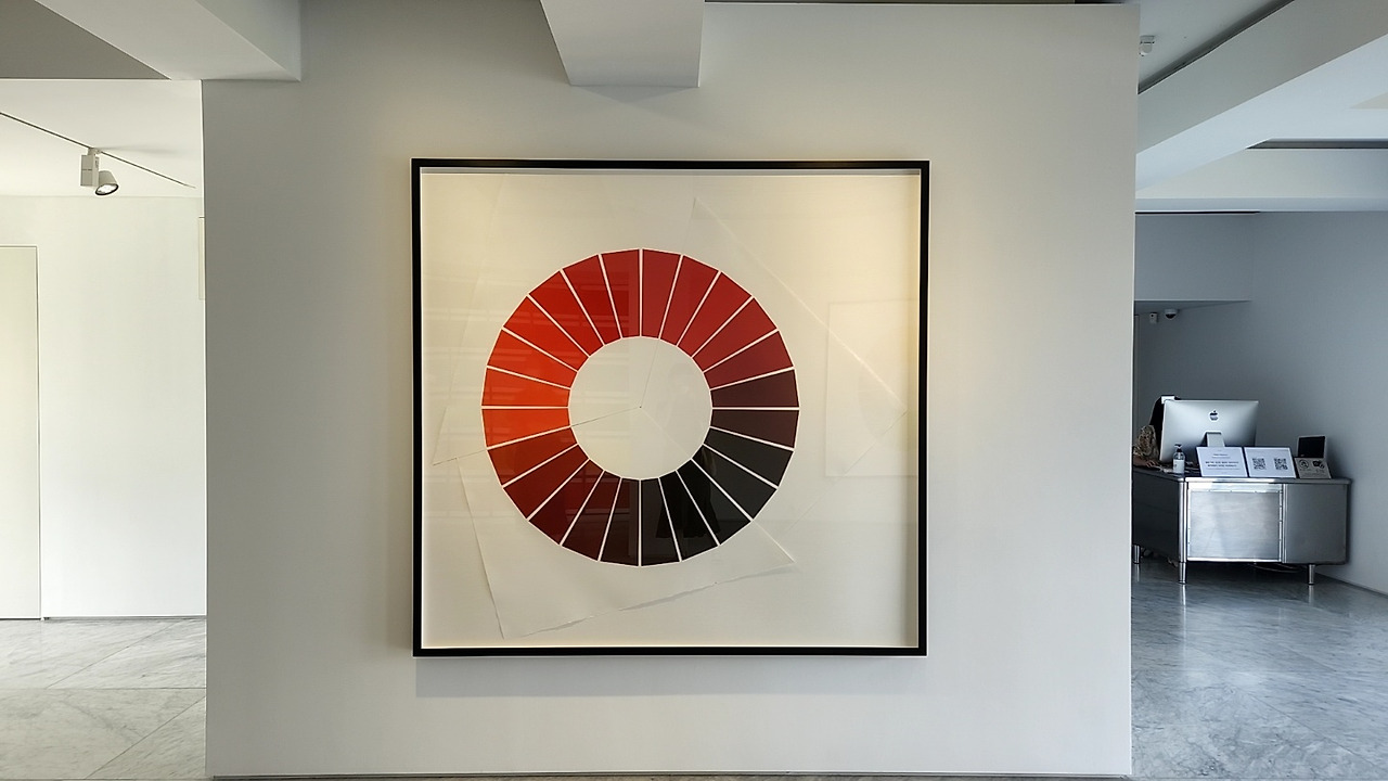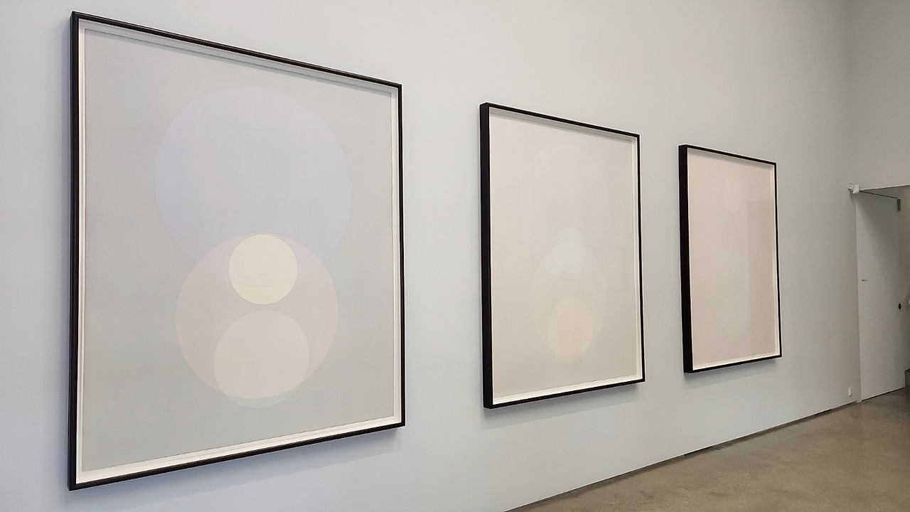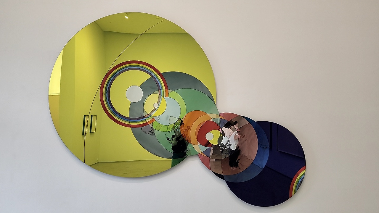 제1전시장에선 색채 현상 탐구에 기반한 작품들이 전시되어 있다. 작가는 색은 그 자체로 존재하지 않고, 빛이 물체의 표면에서 튕겨져 눈의 망막에 도달할 때 구체화된다고 했다. <감성의 플레어 바라보기>는 렌즈 플레어 현상에서 기인한다. 렌즈 플레어 현상은 렌즈가 밝은 빛을 향할 때 원의 형태로 나타나는 빛의 현상으로, 사진이나 영화 분야에선 폐기해야 할 요소이다. 하지만 작가는 불필요한 요소를 예술 제작의 모티브로 삼아 가능성의 요소로 재탄생시켰다.