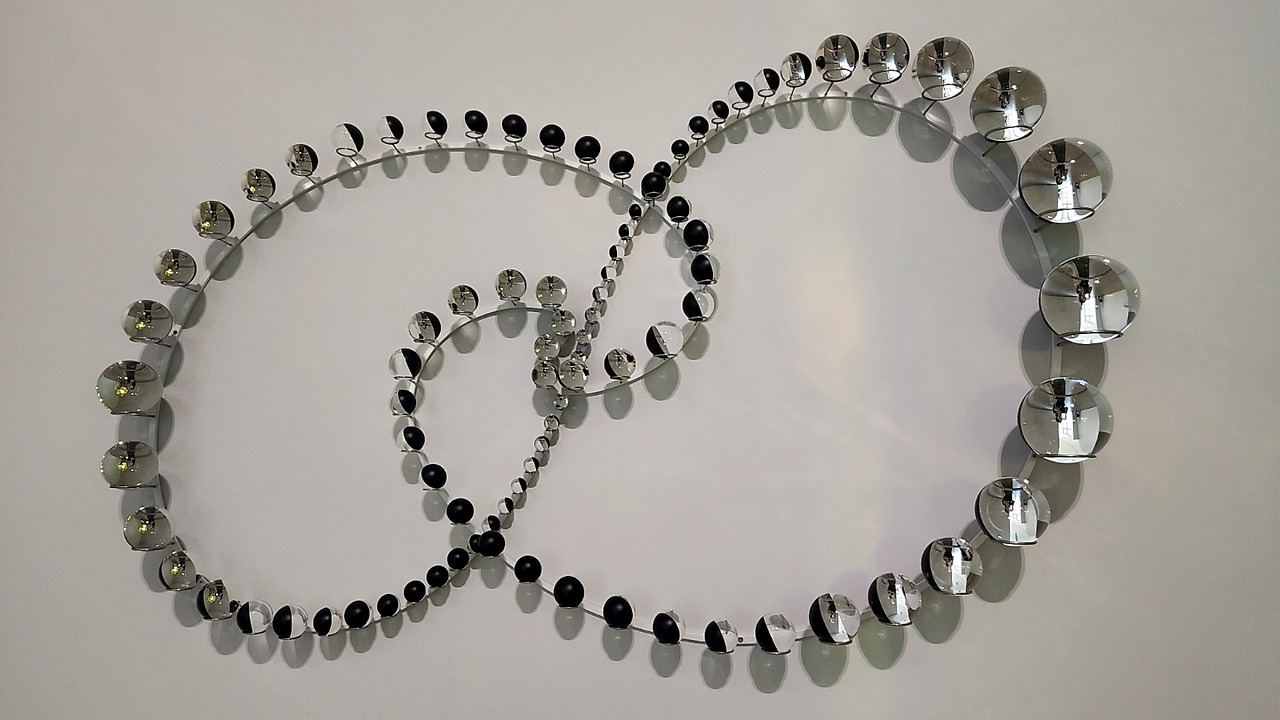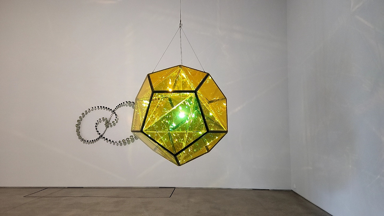 이번 전시의 하이라이트는 제2전시장을 영롱한 빛으로 꽉 채운 <당신의 폴리아모리 영역>이다. 하나의 다면체가 빛의 투과와 반사를 동시에 일어나게 하며, 보는 각도에 따라 색상과 구도는 달라진다. 나아가 벽면에 비친 색의 그림자는 또 다른 경험을 선사한다. <밖으로 향하는 궤도의 실재>와 <가깝고도 우연한 만남의 궤도>는 천구의 자오선을 따라 이동하는 수학적 도형에서 영감을 얻었다. 유리 구슬로 이루어진 작품을 보려면, 유리에 비치는 나와 전시 공간, 다른 수많은 구슬들을 함께 마주하게 된다. 이를 통해 감각이 증폭되는 새로운 경험을 할 수 있다.