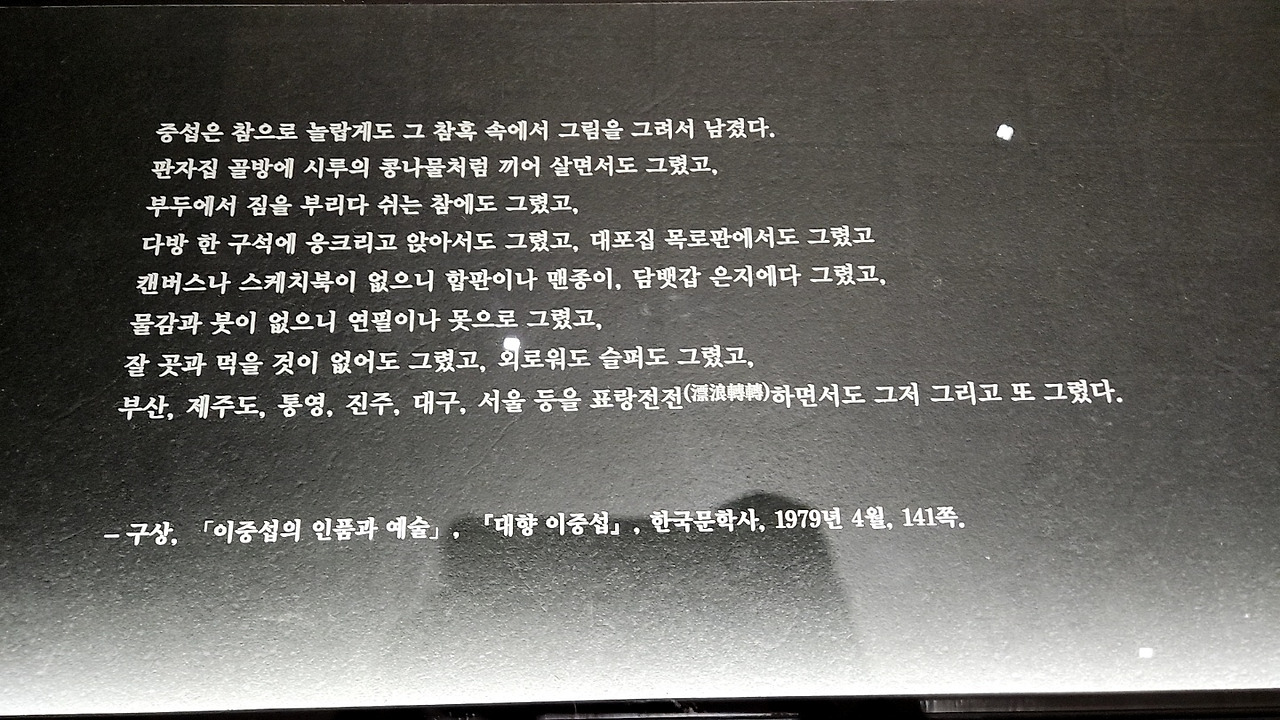 중섭은 참으로 놀랍게도 그 참흑 속에서 그림을 그려서 남겼다. 판자집 골방에 시루의 콩나물처럼 끼어 살면서도 그렸고, 부두에서 짐을 부리다 쉬는 참에도 그렸고, 다방 한 구석에 웅크리고 앉아서도 그렸고, 대표집 목로판에서도 그랬고 캔버스나 스케치북이 없으니 합판이나 맨종이, 담뱃값 은지에다 그렸고, 물감과 붓이 없으니 연필이나 못으로 그렸고, 잘 곳과 먹을 것이 없어도 그렸고, 외로워도 슬퍼도 그렸고, 부산, 제주도, 통영, 진주, 대구, 서울 등을 표랑전전하면서도 그저 그리고 또 그렸다. - 구상, '이중섭의 인품과 예술' 中