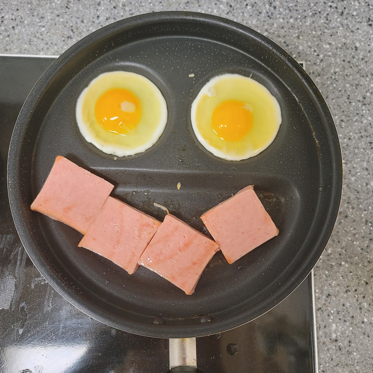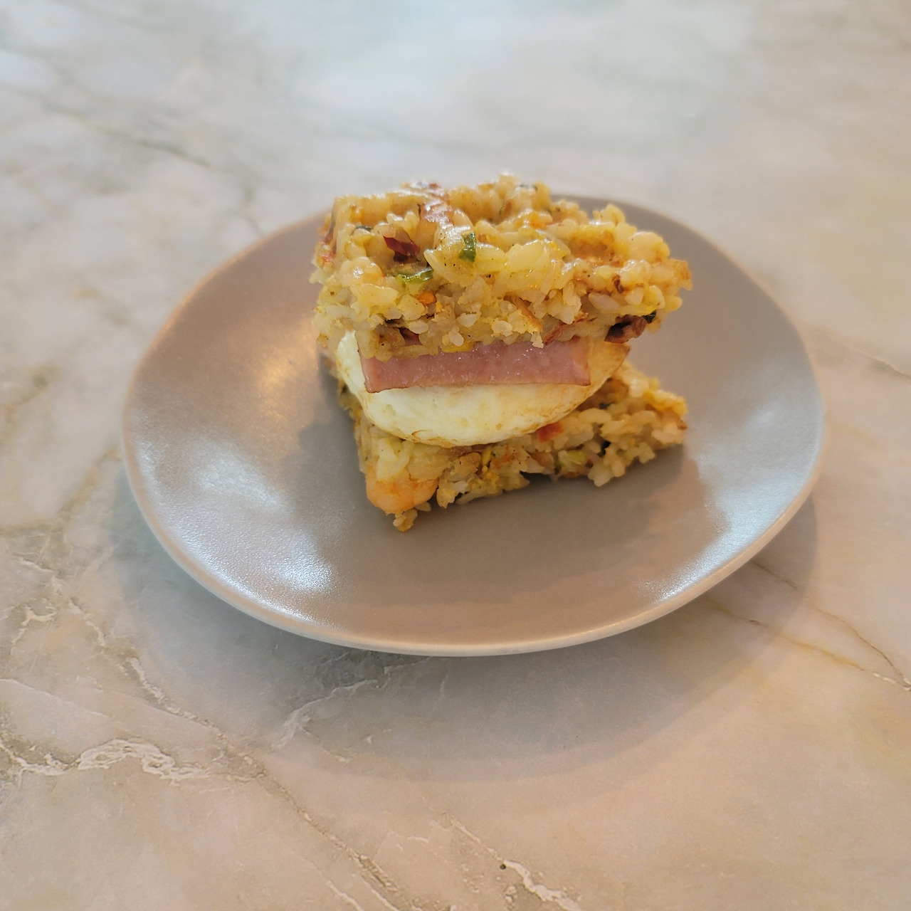 밥 위에 계란 프라이, 햄, 치즈를 얹고 밥을 덮는다. 볶음김치를 넣으면 어른이를 위한 밥버거가 완성된다.