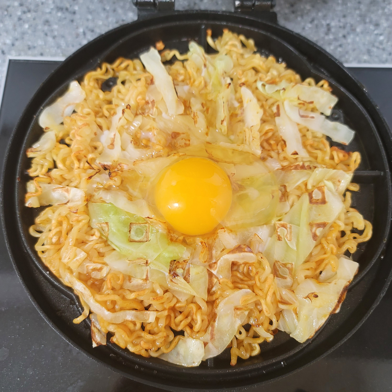 3분 정도 익힌 후 뒤집어서 3분 더 굽는다. 이 때, 라면 바닥 부분이 약간 바삭해질 정도로 시간 조절을 한다.