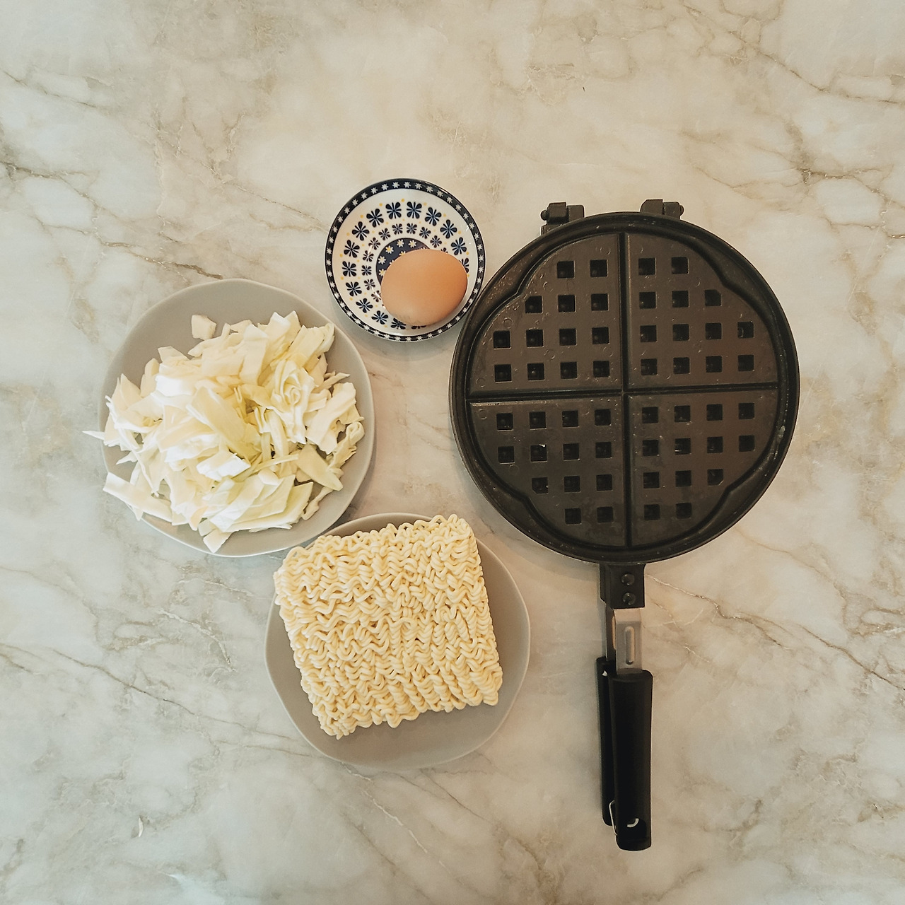 식용유를 바른 와플팬에 면을 넣고 야채를 얹는다.