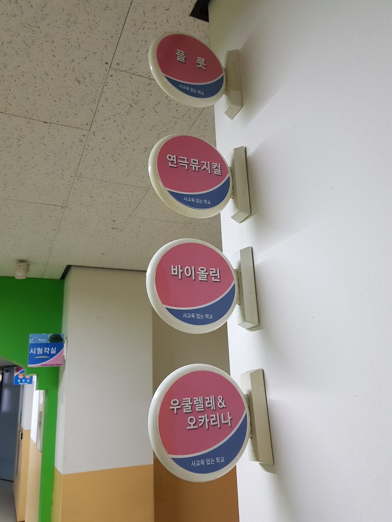 재재가 가는 학교는 작년에 1학년이 총 6반이었고 한 반에 인원은 20명 남짓이었다. 1학년만 전교에 130명 정도이다. 교실뿐 아니라 과학실, 음악실 등 특활교실, 돌봄 교실 등이 마련되어 있다. '사교육 없는 학교' 특활교실에 쓰여있는 문구가 눈길을 끈다. 영어, 뮤지컬, 바이올린, 과학 등 다양한 방과 후 수업을 하고 있다.