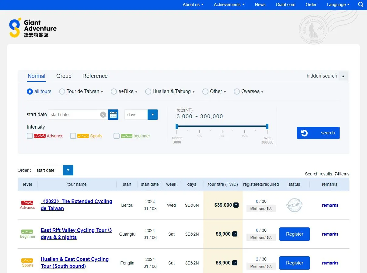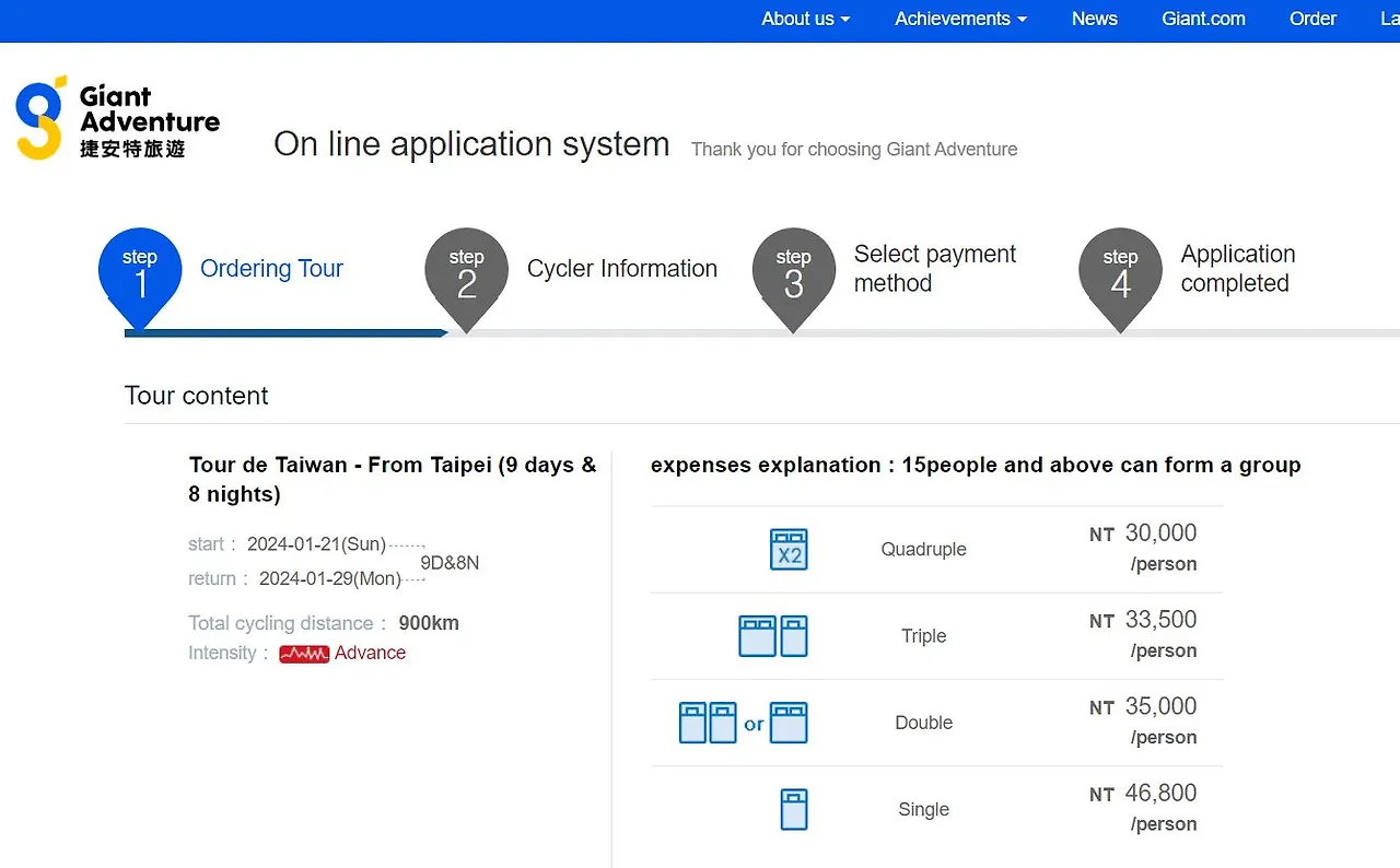 자이언트에서 운영하는 자전거 투어는 자전거를 사랑하는 전 세계 자전거인들에게 버킷리스트로 꼽힌다. 다양한 코스가 있지만 타이베이에서 출발해서 하루에 100Km씩 8박 9일간 900Km 거리의 대만을 한 바퀴 도는 코스에 많은 사람들이 도전한다. 대만일주 외에도 다양한 기간의 다양한 코스가 있다. 초보자를 위한 2박 3일 코스도 있으니 본인의 체력을 감안해서 원하는 코스를 고를 수 있다. 해외 원정 코스도 운영 중이고 그중 5박 6일의 대한민국 국토 종주 코스도 있다.