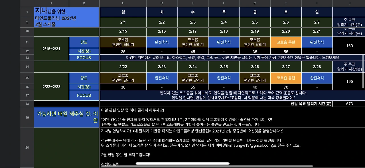 지난달 <명상과 마인드풀 러닝>을 함께 한 마인드풀 러닝 스쿨에서 <마인드풀 러닝 정규반>이란 이름으로 내가 달릴 수 있는 날을 알려주면, 그에 따른 스케줄을 짜 주고, 동기부여 메일, 또 기록지 등을 메일로 보내준다.
