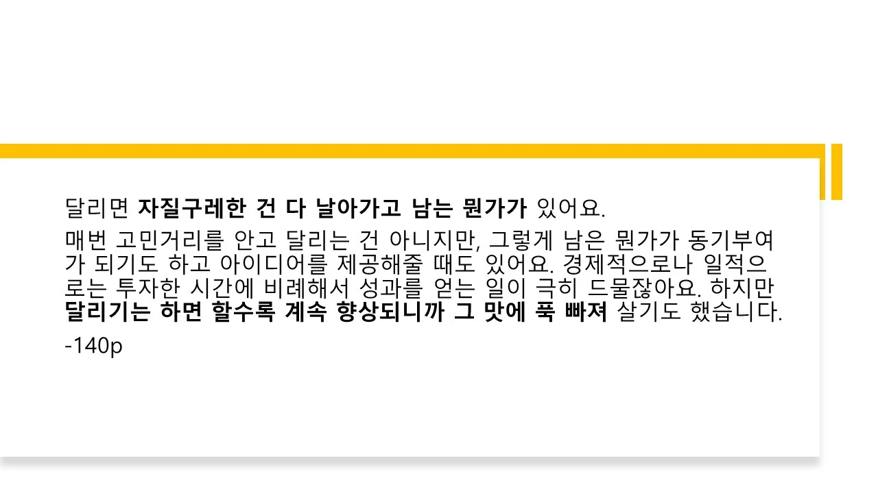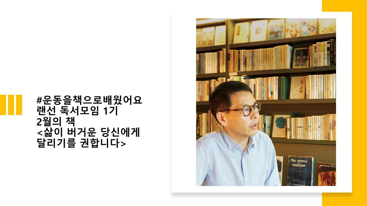 #운동을책으로배웠어요 랜선 독서모임 1기 1/2월의 책모임을 잘 마쳤다. 운동하며 책이 크고 작은 동기부여가 되기에 나 혼자 읽지 않고, 같이 읽고 나눠보자는 게 그 시작이었고, 소규모로 책 후기도 직접 쓰고, 읽으며 다양한 이야기를 나눠봤다. 지난달에는 김연수 작가의 <지지 않는다는 말> 이번 달은 <삶이 버거운 당신에게 달리기를 권합니다> 달리기, 마라톤, 실패, 도전 •• 결국은 삶에 대한 태도를 다지며 작은 습관의 힘을 눈으로, 글로 보고 듣는다.