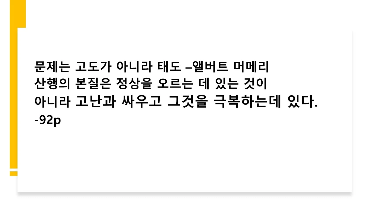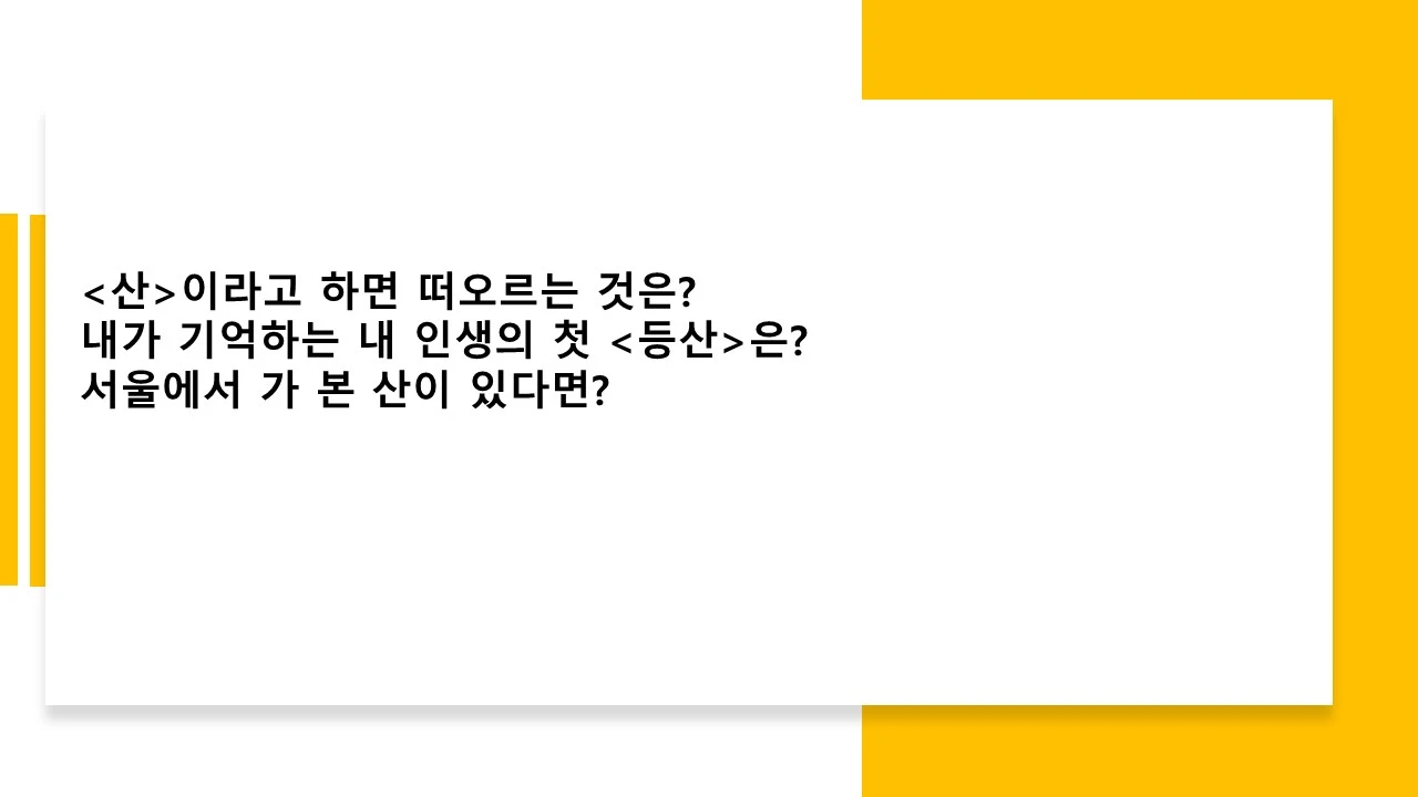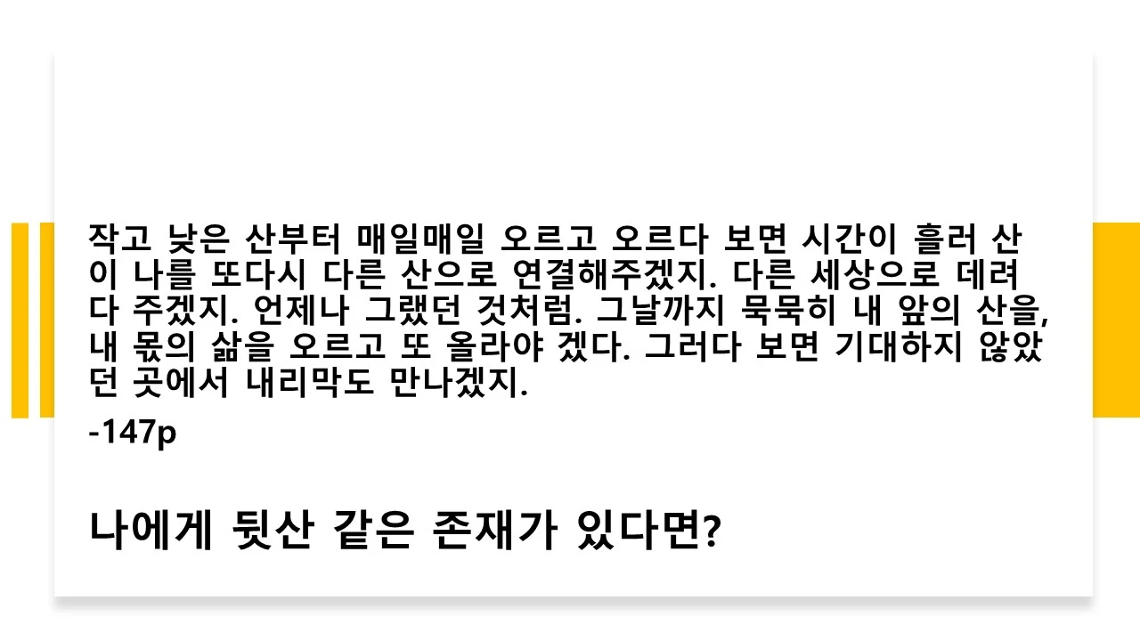 산에 대한 각자의 경험, 기억, 또 책을 보고 난 뒤 쓴 글, 좋았던 문장을 입 밖으로 꺼내며 어떤 부분이 좋았는지 정리해서 말하는 경험..!! 이 시간이 끝나고 나면 나도 잠시 모니터 앞에 앉아 같이 나눈 말을 곱씹게 된다.