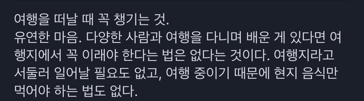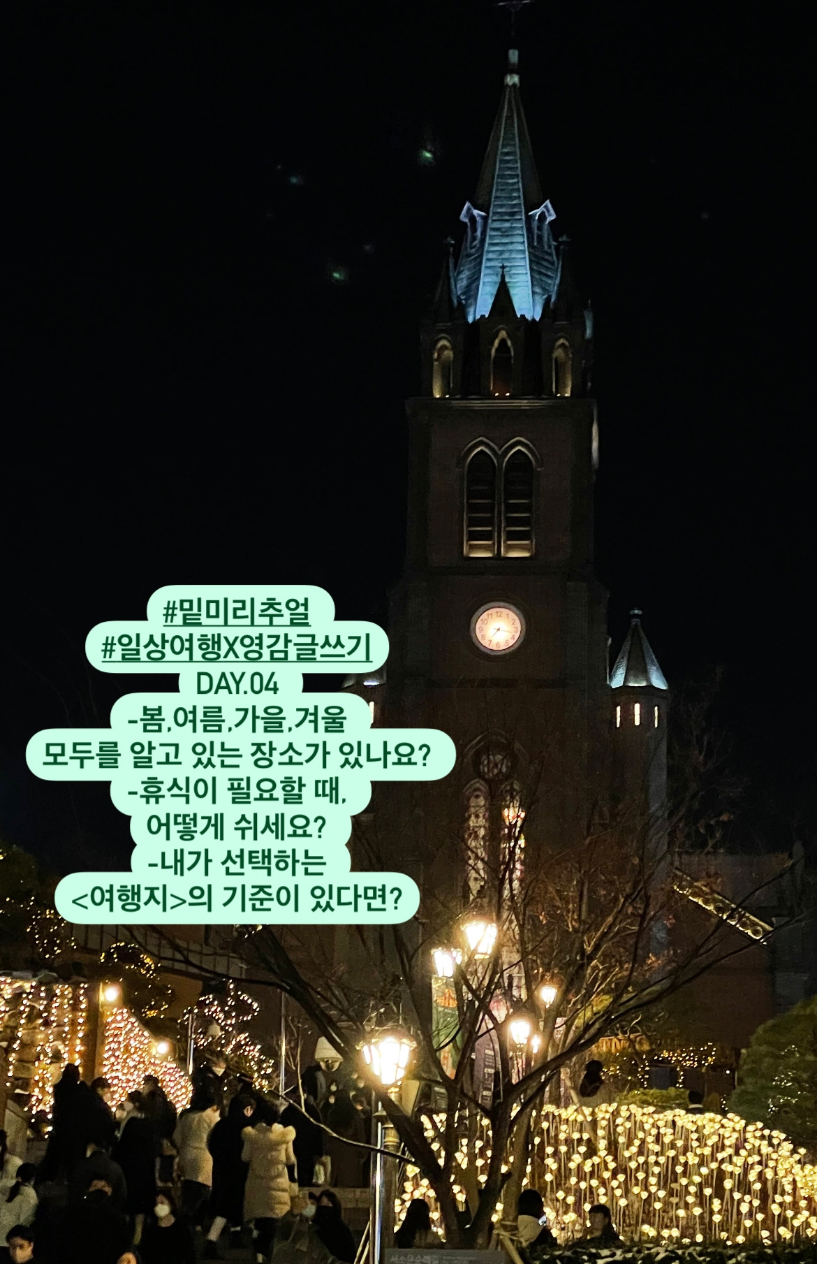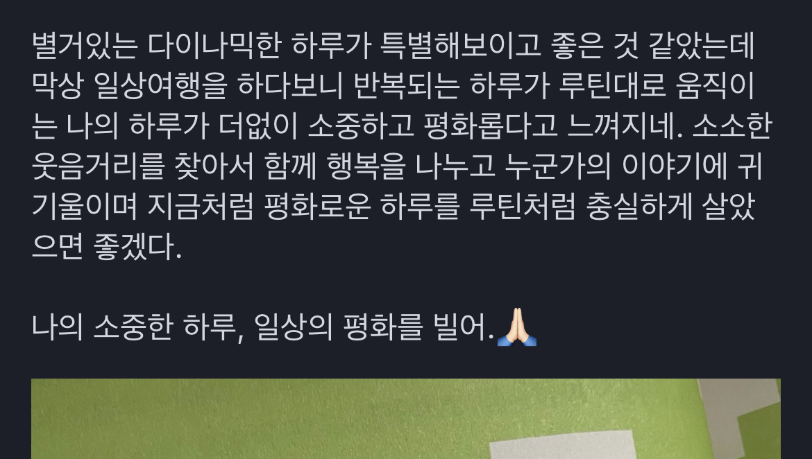 저는 먼 곳을, 꼭 비행기 타고 유명한 길을 걷고 돌아오는 것만이 ‘여행’이 아니고, 매일 오가는 길의 동선을 달리하는 것, 또 좋아하는 공원이나 평소 아끼는 한 그루 나무의 사계절을 아는 것 등 그런 작은 시도가, <일상 여행>이 된다고 믿고 있고, 그렇게 생각하며 제 일상엔 매일의 작은 기쁨이 싹틀 수 있었던 것 같습니다.