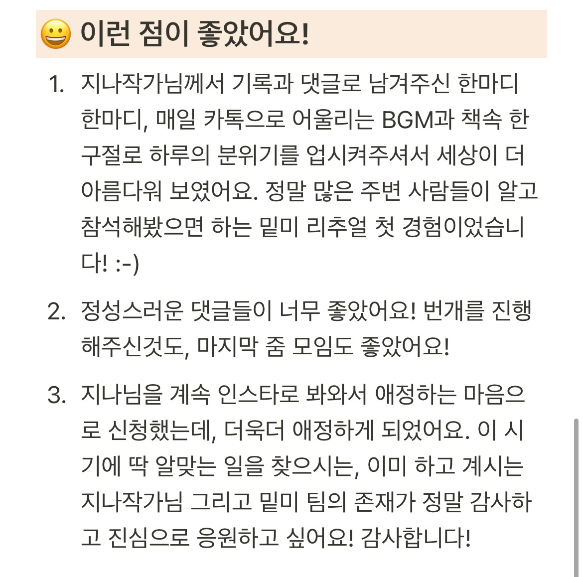 밑미 리추얼을 통해서 자신의 일상 안 반복되는 행위와 의미부여를 통해, 보다 단단한 삶으로 나아갈 수 있다고 믿고, 저도 그 덕을 많이 보았다고 생각합니다.