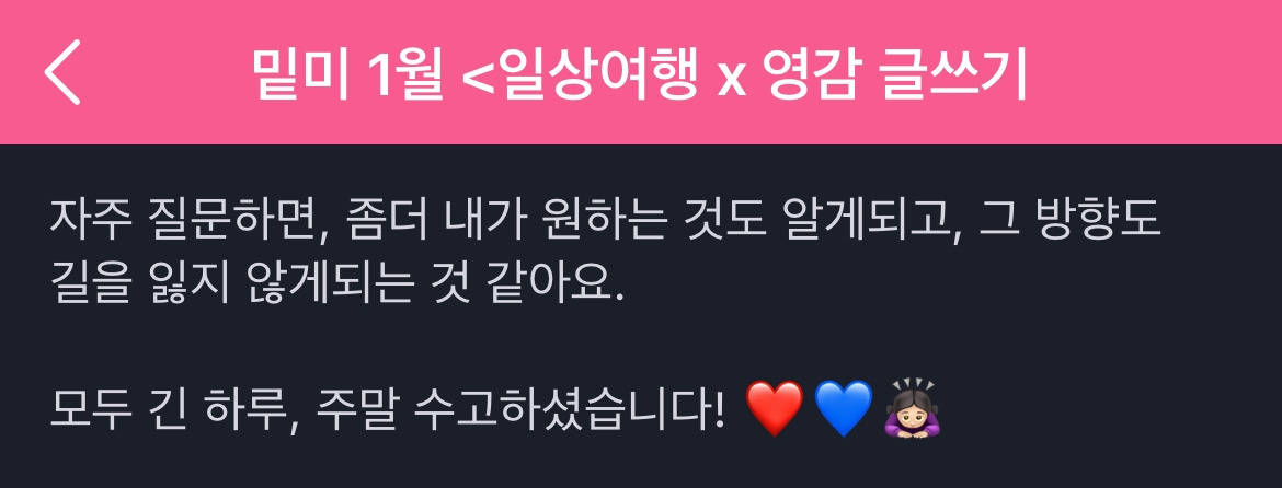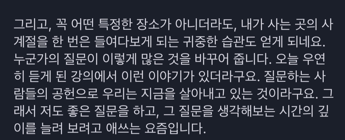훗날엔 이 질문이 없어도 스스로 하루를 정리하고, 또 그날의 작은 행복을, 영감을 발견할 수 있느리라 생각합니다.
