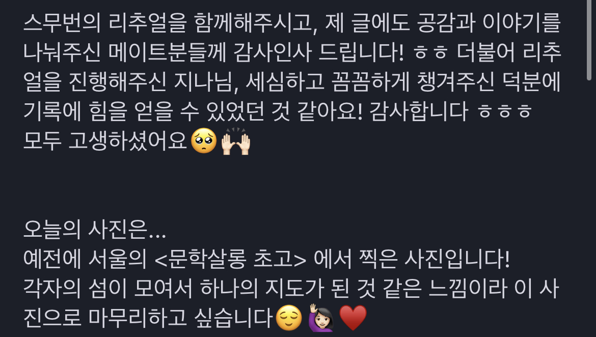 작년 봄 시작해 어느새 몇 번의 계절이 바뀌고, 함께한 분들의 이야기도 모아서 간단히 리추얼 소개를 해보려고 합니다.