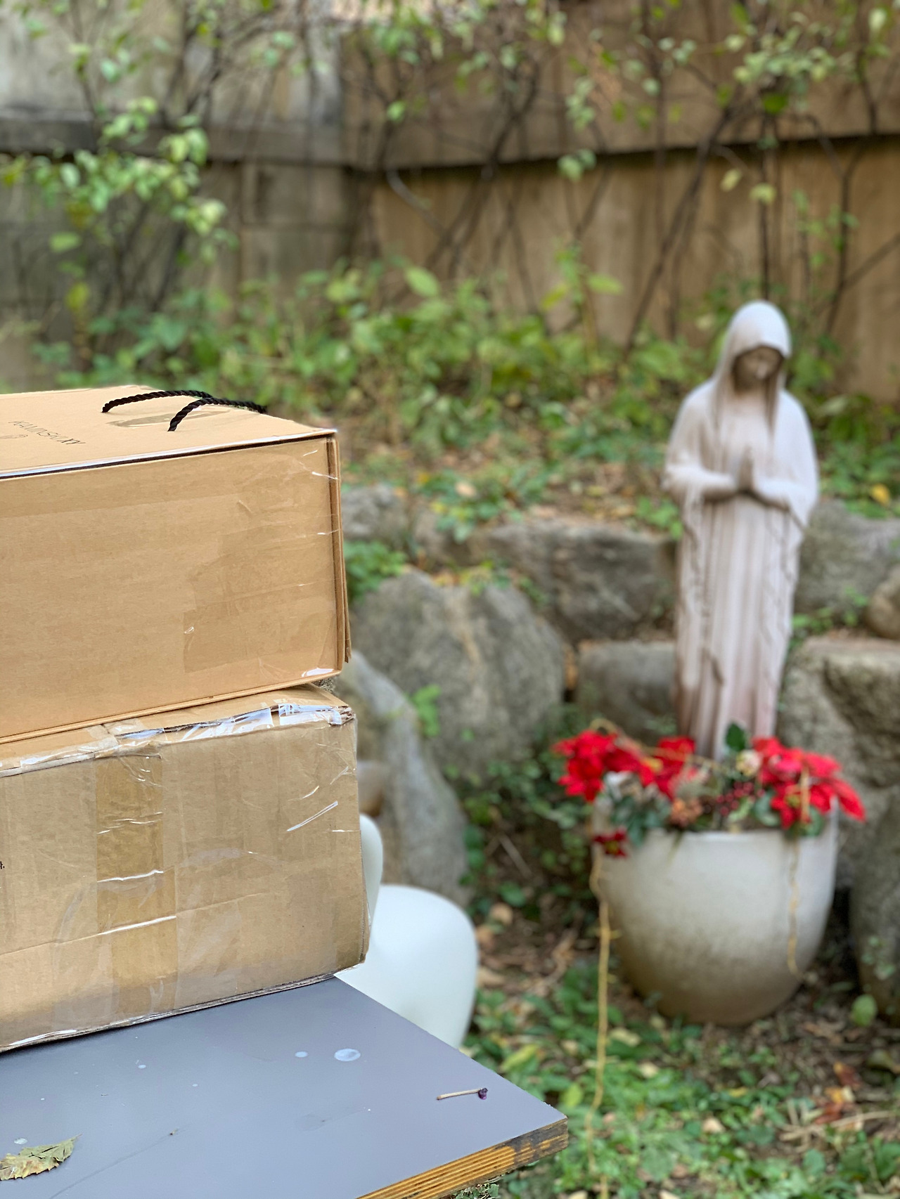 한 상자에 담긴 리스, 조명, 조화 포인세티아는 단양의 명옥 이모님에게, 또 다른 한 상자는 엄마와 오랜 시간 알고 지낸 수녀님께 보내려고 택배를 싸놨다.