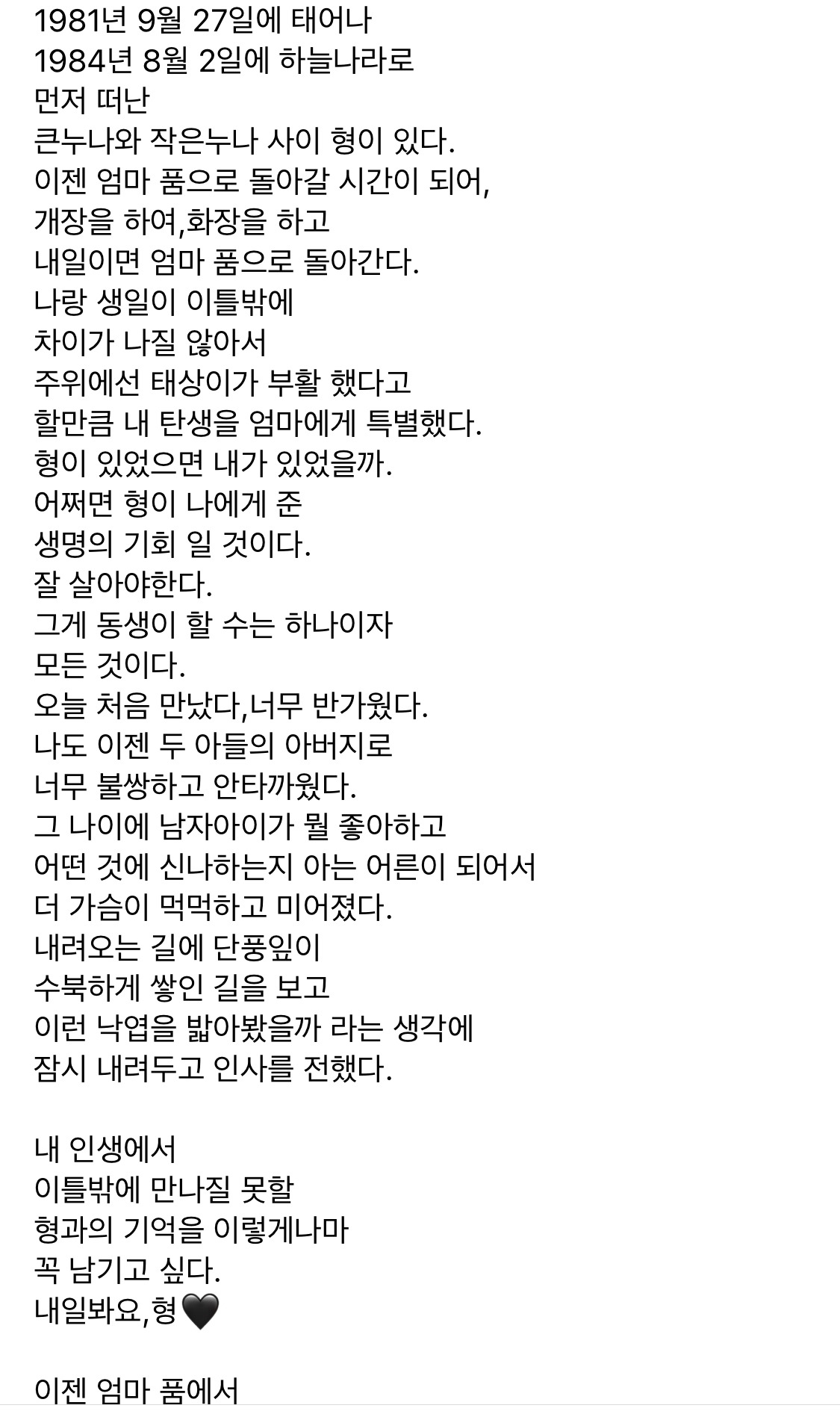 동생이 집으로 돌아간 뒤 올려둔 인스타그램 글을 읽고 오늘 가장 많이 운 것 같다. 아래 덧붙이며.