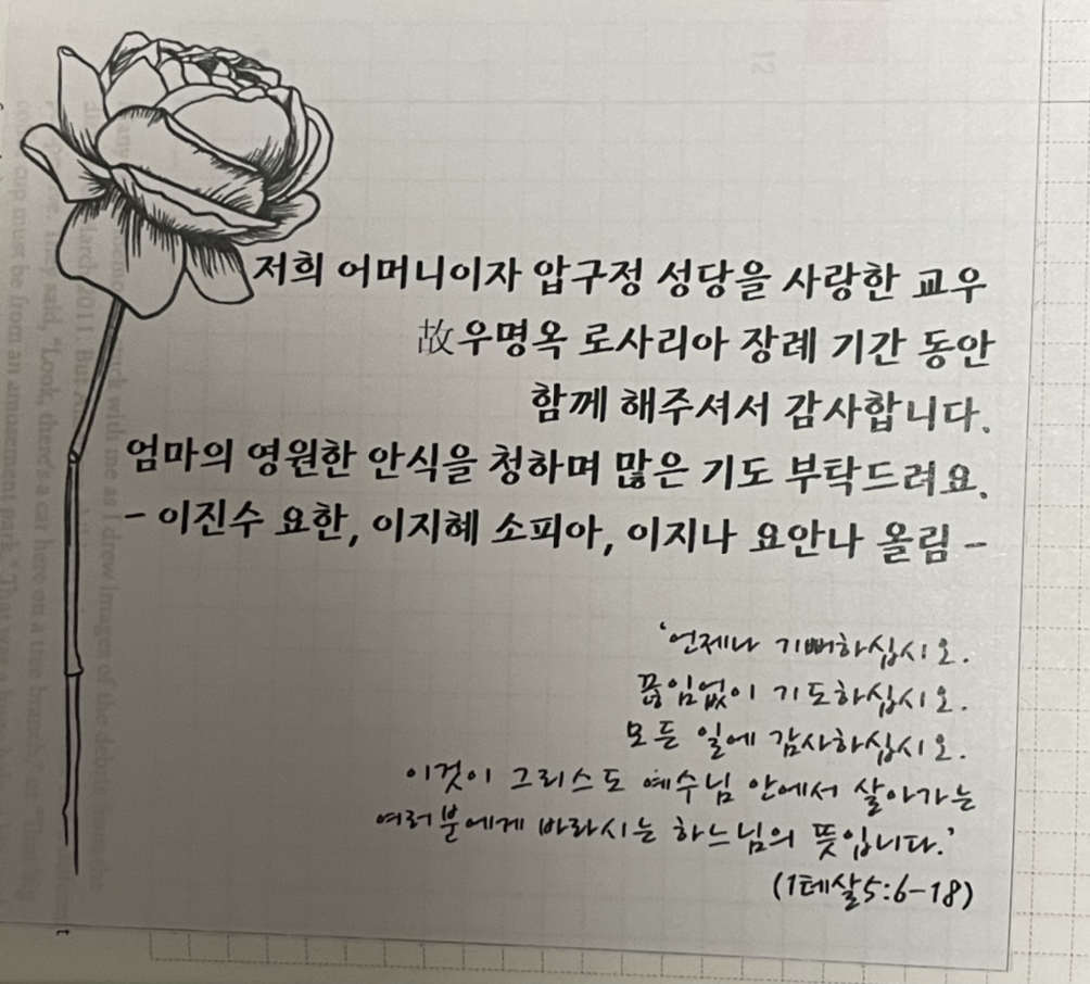 기뻐함, 감사, 기도••• 이 구절을 외우게 된 건 청년 활동하던 때 신부님의 아버님이 갑자기 돌아가셨는데, 늘 성경공부나 봉사에도 열심이던 아버님이 가지고 다니시던 지갑 속 메모지에 적힌 구절이었다고 했다. 꼬깃꼬깃 적혀있던 종이에 이 성경말씀이 적혀있었는데, 신부님이 생각하기에도 아버님은 진정 그렇게 사신 것같다는 말씀과 함께.