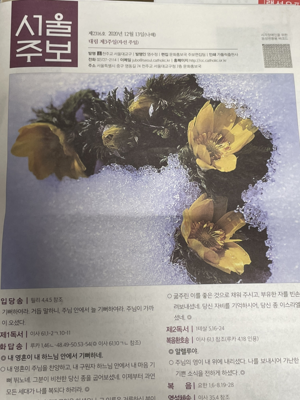 #성당일기 대림 3주차 미사는 평화방송 유튜브에서 올려둔 정순택 주교님 미사로 드렸다. 봄에 한참 미사가 중단되었던 때가 생각나며, 그래도 이렇게 명동성당 성전 안의 모습을 보며, 1년에 딱 두 번 입으시는 분홍색 제의 입으신 모습을 영상으로라도 볼 수 있어서 좋았다. - 대림 3주인 오늘은 세번째 초에 불이 켜지고, ‘가우다떼 주일’이라고 한다. “기뻐하여라”라는 라틴어 단어에서 유래된 것으로 오늘 미사 입당송의 시작이라고. (매일미사 12/13 참조) 대림시기의 성전은 볼거리라 풍부하다. 아직 아기예수가 없는, 하지만 자리가 마련돼있는 구유, 트리, 대림환, 대림 초••• - 오늘의 2독서는 엄마 장례미사를 봐주신 신부님이 장례식장에 오셨을 때, 내일 미사 중 이야기 하실 때 참고하게- 엄마가 평소에 자주 말했던 것, 좋아하는 성경구절 등이 있으면 좀 적어달라고 하셨을 때 내가 적어드린 구절이었다. 그래서 엄마 장례미사에서도 신부님의 입을 통해서도 다시 들은 말씀이었다.