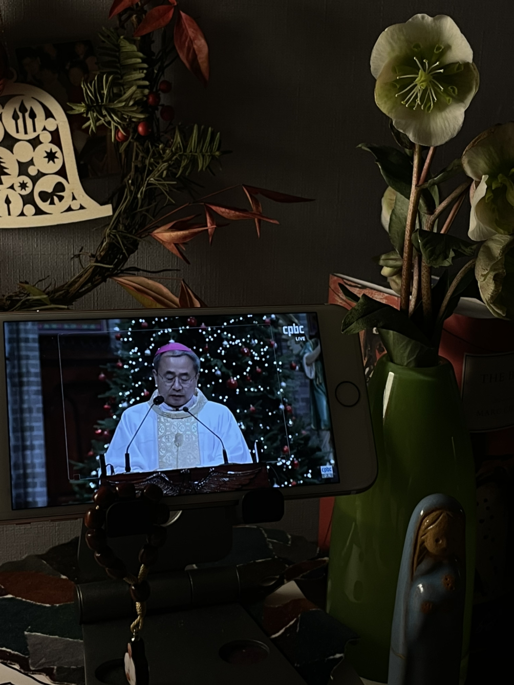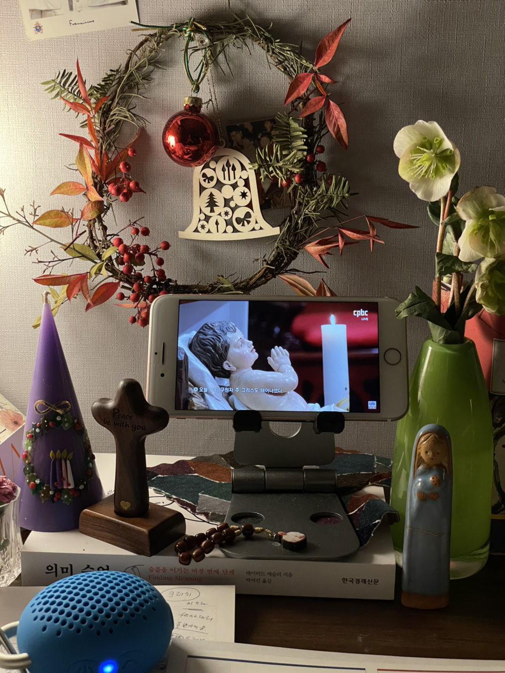 주님 성탄 대축일 밤 미사 가톨릭 평화방송, 밤 10시, 손희송 베네딕도 주교님의 미사로 함께 했다. 입당곡이 나올 때부터 울컥한 마음•• 1년에 한번, 성당에 올까말까 한 이들도 오는 날인 오늘의 미사에, 다닥다닥 붙어앉아 미사드린 기억이, 가까운 미래엔 힘들 것같아서도, 성가대가 가장 열심히 연습하고 웅장하게 노래하는 미사였던 게 떠올라서•••