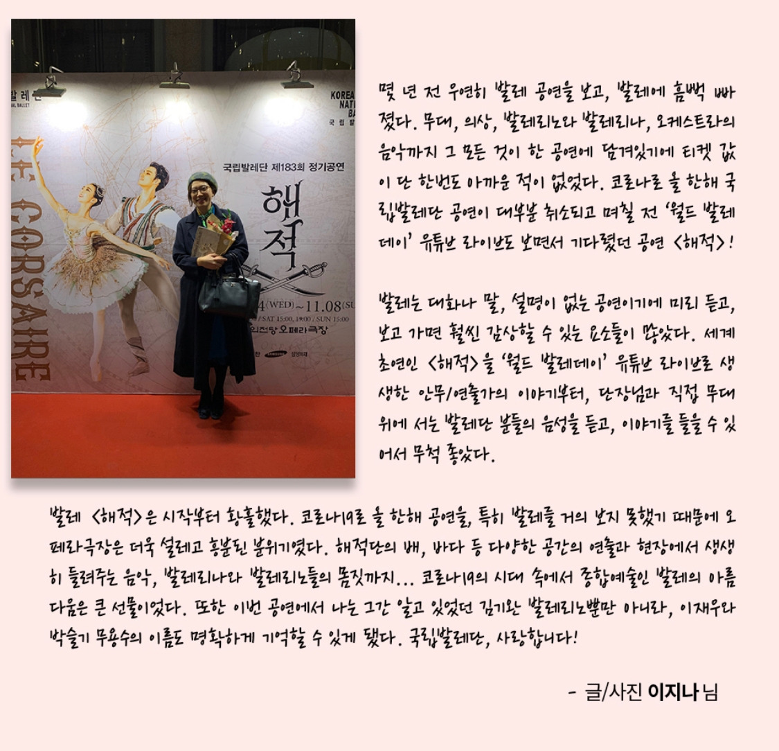 국내 초연으로 본, 좋아하는 이들과 2층 맨 앞자리에서 본 국립발레단 <해적>. 김기완 발레리노, 이재우 발레리노.. 사랑합니다 :) +다녀온 뒤에 애정을 담아 뉴스레터에 후기도 보냈는데 담겨서 메일이 왔고, 선물도 받았다. (예술인패스가 있어서 국립발레단의 공연은 할인받아 볼 수 있다! 새해에는 더 많은 공연을 공연장에서 볼 수 있길 바란다.)