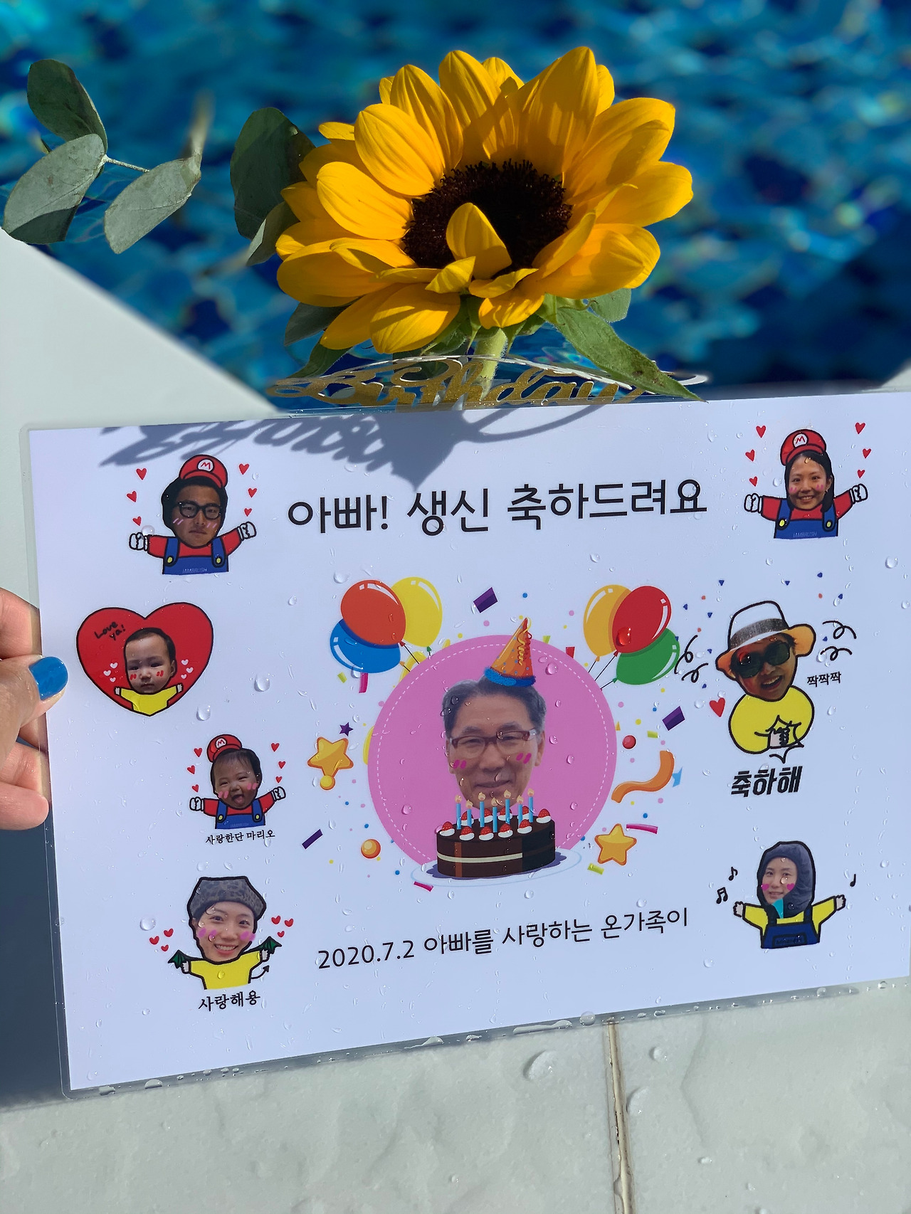 아이디어: 아빠 생신 식사 때, 식당 가면 아래 깔아주는 종이가 있듯이, 우리 가족 얼굴을 담아서 디자인 한 종이를 코팅해서 식사 시간에 깔아 두었다.