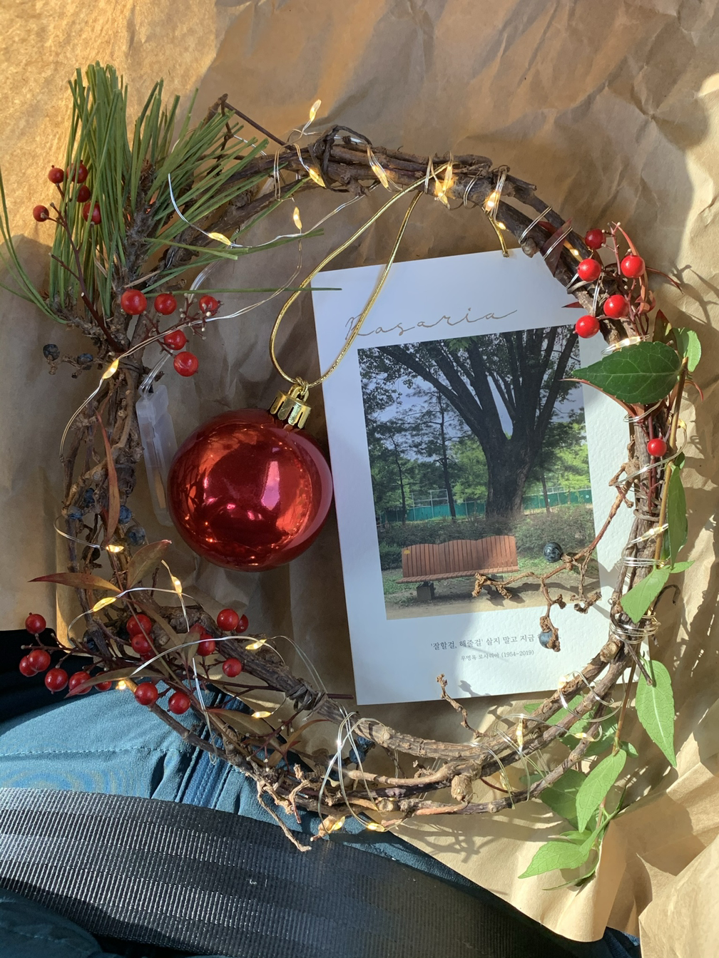 선물: 운전을 시작했다는 이야기를 읽고 보내준 성물과 운전자를 위한 기도문, 은행잎 모양 나무 플레이트. “추석 송편 내가 사뒀어!”, “언니가 크리스마스 케이크 사 줄게.” •• 돌아보면 늘 누군가 챙기는 일과 그 역할이 더 익숙했는데 올해는 나를 챙겨주는, 게다가 동네 언니를 만나게 된 것도 큰 선물이다.