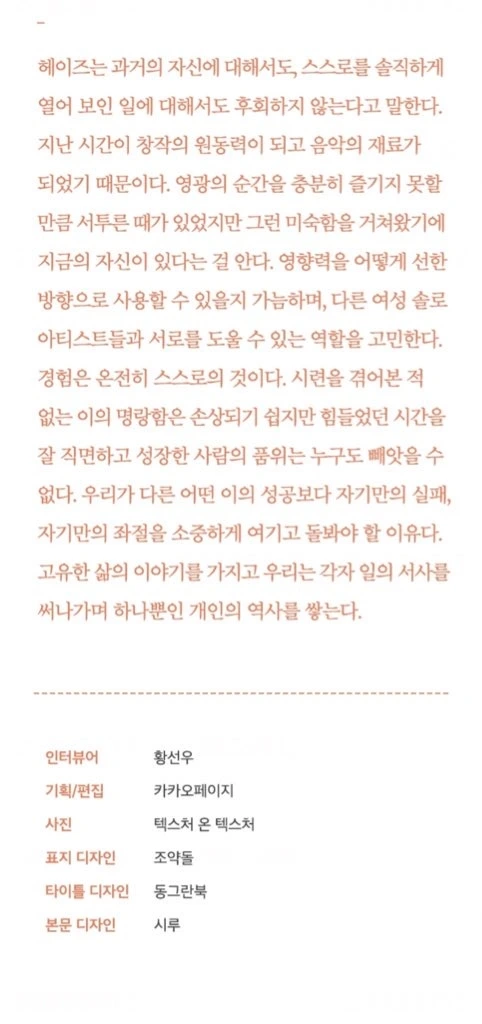 기사: 황선우 작가님의 카카오 페이지 인터뷰 <멋있으면 다 언니>의 모든 인터뷰가 좋았지만, 특히 해이즈의 인터뷰, 이 끝 정리 글이 당시 계약해지 당하고(?) 괴로워하던 내 맘을 달래줬다.
