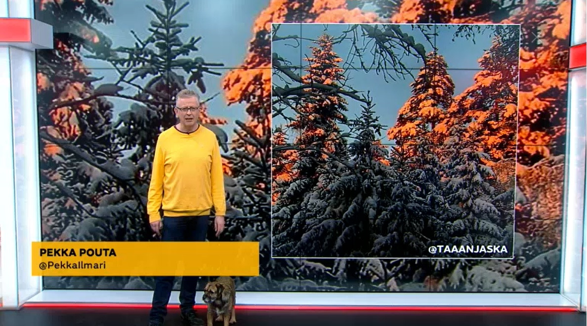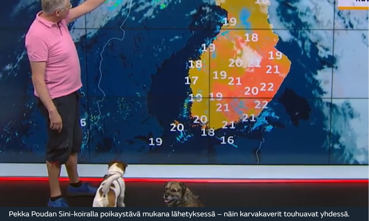 그러던 와중에 우연히 TV를 보다가 이 신박한 기상캐스터 분을 발견하게 되었다. 너무나 편안한 복장으로 날씨 정보를 알려주고 있어서 ‘와, 이 분 뭐지?’ 하며 신선한 느낌으로 보고 있었는데, 조금 있으니 강아지가 슬슬 화면 속으로 걸어 들어와 자유롭게 기상 캐스터 아저씨 주위를 어슬렁거린다. 다리 사이에서 가만히 앉아 있거나 다시 어슬렁거리면서 아저씨를 쳐다보는 모습은 마치 둘이 산책하다가 방송국에 잠깐 들러서 날씨 정보를 알려주고 다시 나가서 산책을 계속할 것만 같은 느낌이었다. 다른 영상들을 더 찾아보니 여름에는 반바지를 입기도 하고 반려견의 남자 친구와 함께 두 마리가 같이 출연하는 방송도 있었다. 또 진행하는 분위기도 너무 편안하고 자연스러워서 중간에 혼자 빵 터져서 웃으면서 끝나는 방송도 있고 재미있게 CG를 이용한 영상도 있었다. 이런 신박한 기상캐스터라니! 뉴스 방송의 틀을 깨는 신선한 문화 충격이었고 방송에서도 핀란드의 편안함과 자연스러움이 잘 반영된 것 같아서 참 바람직하고 좋은 컨셉이라고 생각했다. 무엇보다도 보면서 마음이 참 편했다. 반면 우리나라 기상캐스터의 날씨 정보는 어떨까?