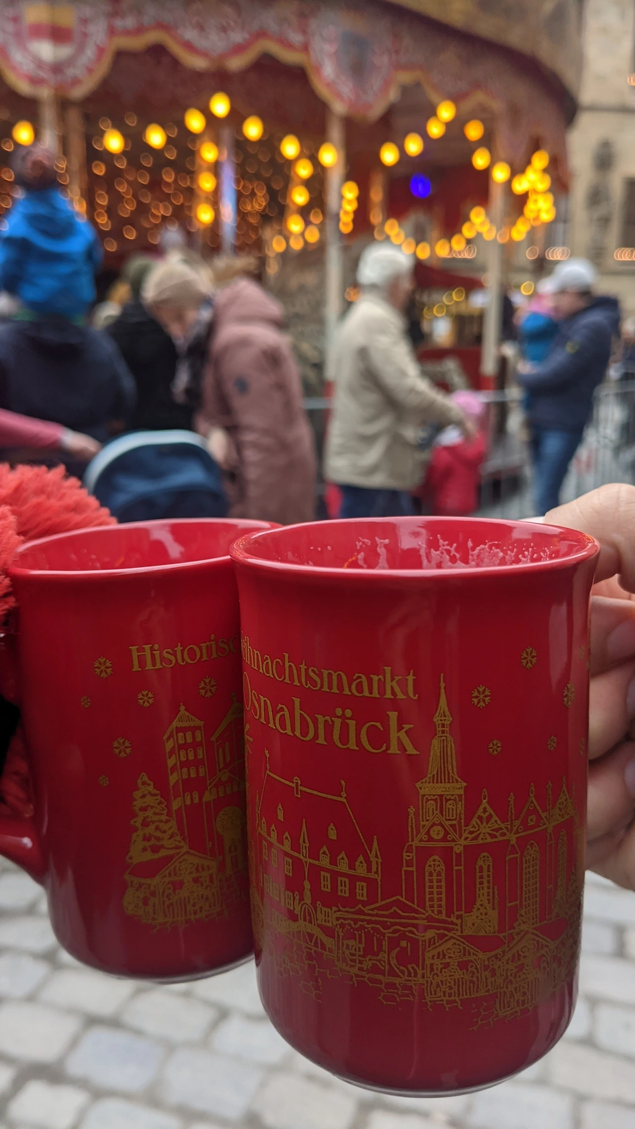 크리스마스 마켓에서는 어두운 겨울밤을 밝혀줄 다양한 크리스마스 조명과 공예품, 아이들을 위한 회전목마 같은 놀이기구, 지역 특산품 등 다양한 물건을 판매한다. 아기자기한 공예품을 구경하는 건 언제나 재미있어서 마켓이 열리는 내내 계속 크리스마스 마켓을 기웃거리게 된다. 크리스마스 마켓에서 또 빼놓을 수 없는 건 해마다 바뀌는 예쁜 컵에 담긴 따뜻한 글뤼바인(Glühwein)을 마시는 일이다. 보통 컵에 2~3유로 정도의 보증금이 포함되어 있어서 마시고 난 후 반납하면 돈을 돌려받는데, 컵이 마음에 들면 보증금을 받지 않고 가져가도 된다. 그래서 매년 크리스마스 마켓의 컵을 모으는 사람들은 마시고 그냥 컵을 가져가기도 한다. 난 아직 컵을 모아보진 않았지만 도시마다 크리스마스 마켓을 돌아다니면서 예쁜 크리스마스 컵을 모으는 것도 나름 소소한 행복일 것 같다.