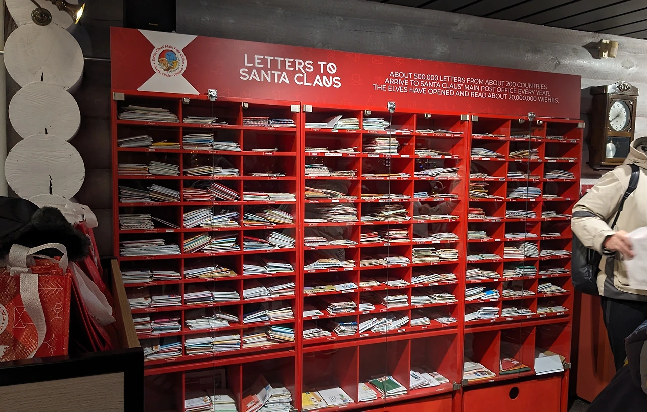산타 우체국에 가니 크리스마스 카드를 쓰고 있는 사람들로 가득했다. 이곳에서 크리스마스 카드나 엽서를 사서 쓴 후에 보내면 특별한 스탬프와 함께 전 세계로 보내진다. 가격은 정확하진 않지만 대략 10유로 (약 15000원) 정도였던 것으로 기억한다. 이곳에는 편지를 보내는 것뿐만 아니라 산타 클로스 마을로 도착한 수많은 편지들이 우체국을 장식하고 있었다. 이번에는 크리스마스 카드를 보낼까나 했는데 안타깝게도 우리는 문 닫기 직전에 산타 우체국에 도착해서 크리스마스 카드를 써서 보낼 시간이 없었다.