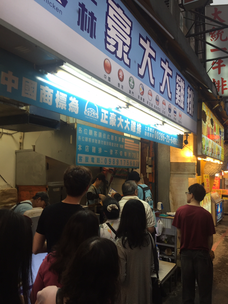 스린야시장에서 가장 줄이 긴 가게가 바로 '치파이' 치킨을 파는 집이다. 얼굴만 한 치킨을 파는데 가격도 참 착하다. 약 2천 원 정도이니 먹어보려 줄을 섰다. 길고 긴 줄이지만 닭을 튀겨내는 속도가 빠르기 때문에 생각보다 줄은 금방 줄어든다. 계산을 하는 사람에게 몇 개를 살지 말하고 돈을 내면 된다.