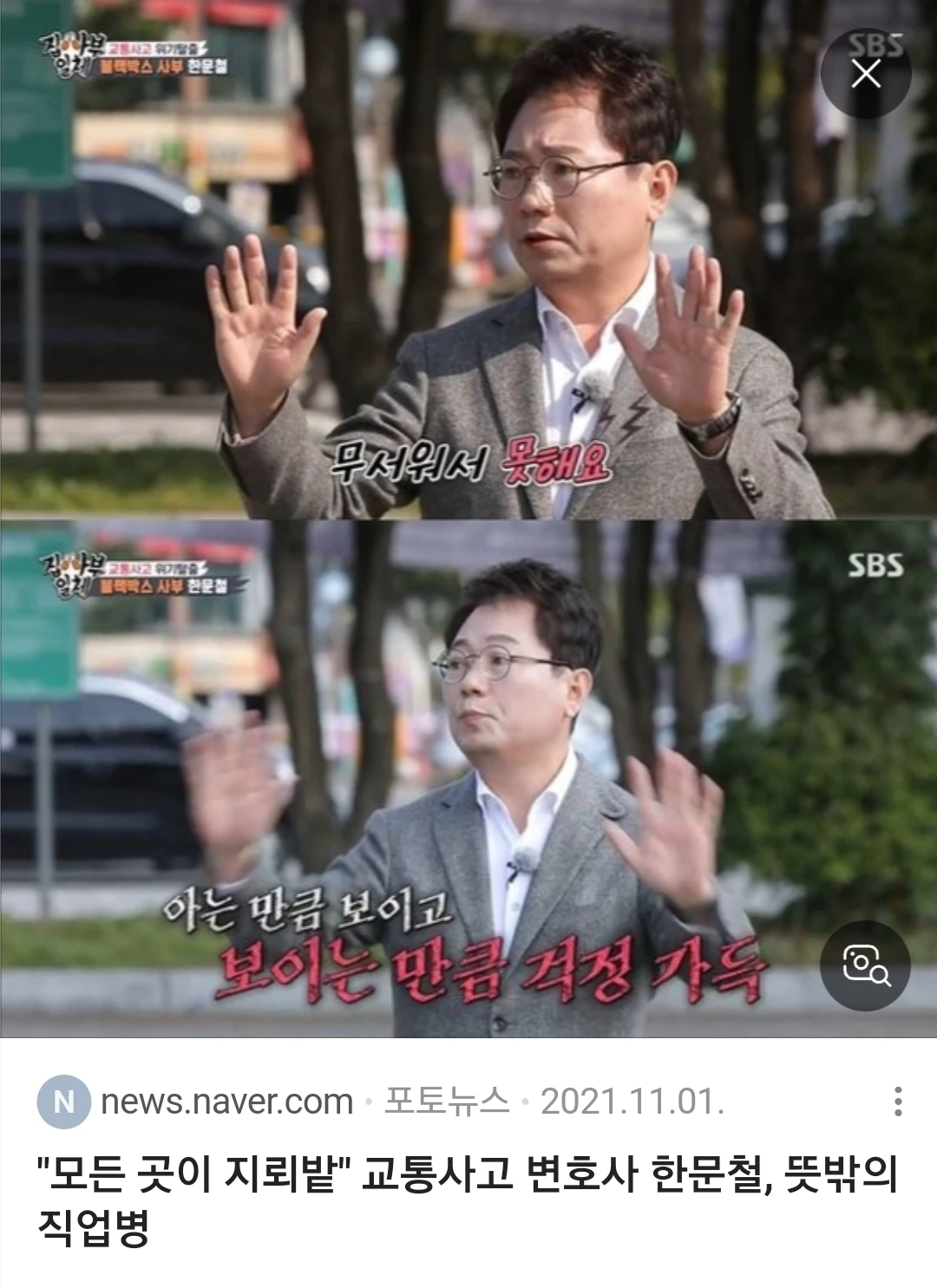 자동차 사고 전문 변호사 한문철 님은 차를 운전할 수 없는 직업병이 있다고 소개한 적 있다.