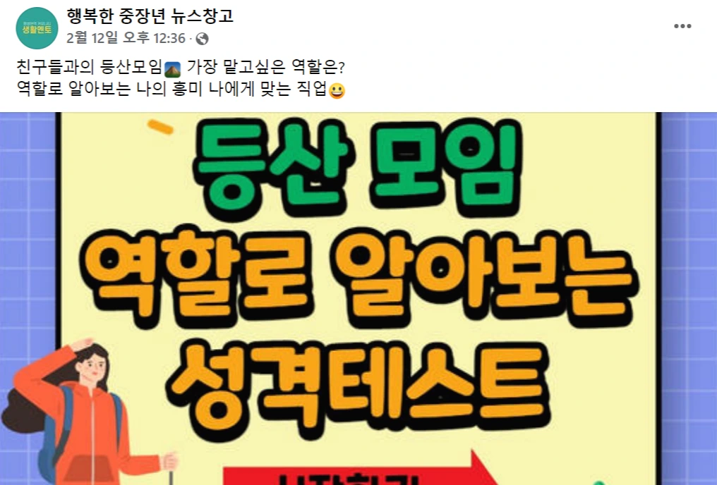 미리캔버스로 뚝딱뚝딱 만들어 5060의 관심 주제인 '등산'으로 성격 테스트를 만들었다. 성격 테스트 끝에는 '평생현역패키지' 이벤트 페이지로 넘어가는 버튼을 추가했고 페이스북 페이지로 사람을 모았다. 하지만 성격 테스트는 많은 분들께서 해주셨는데 성격 테스트만 하시고 대부분 이탈하셨다. 더 고심해서 클릭하고 싶게끔 만들었어야 했나 보다.
