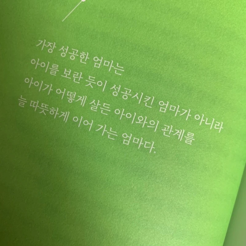 이 책을 읽을 때 가장 눈에 띄는 문장이었다. 아이가 어떻게 살든 아이와의 관계를 늘 따뜻하게 이어가는 엄마. 즉 사랑에 조건이 없는 엄마다. 자식을 위해 자신의 목숨도 바칠 수 있는 게 엄마의 사랑이지만 사랑이라는 이름으로 또 많은 조건과 요구를 제시한다. 공부를 잘해야 하고, 취직을 잘해야 하고, 결혼을 잘해야 하고... 마음 같아서는 잘하고 싶지만 때로는 잘 안될 때도 있는 게 인생이다. 그럴 때마다 쿨하게 “괜찮다”라고 말하며 아이를 꼭 안아주는 엄마는 몇이나 될까? 특출 나게 키웠지만 평범하기 그지없는 자식이 실망스럽고 답답해서 매정한 말을 하면서 상처를 준다.