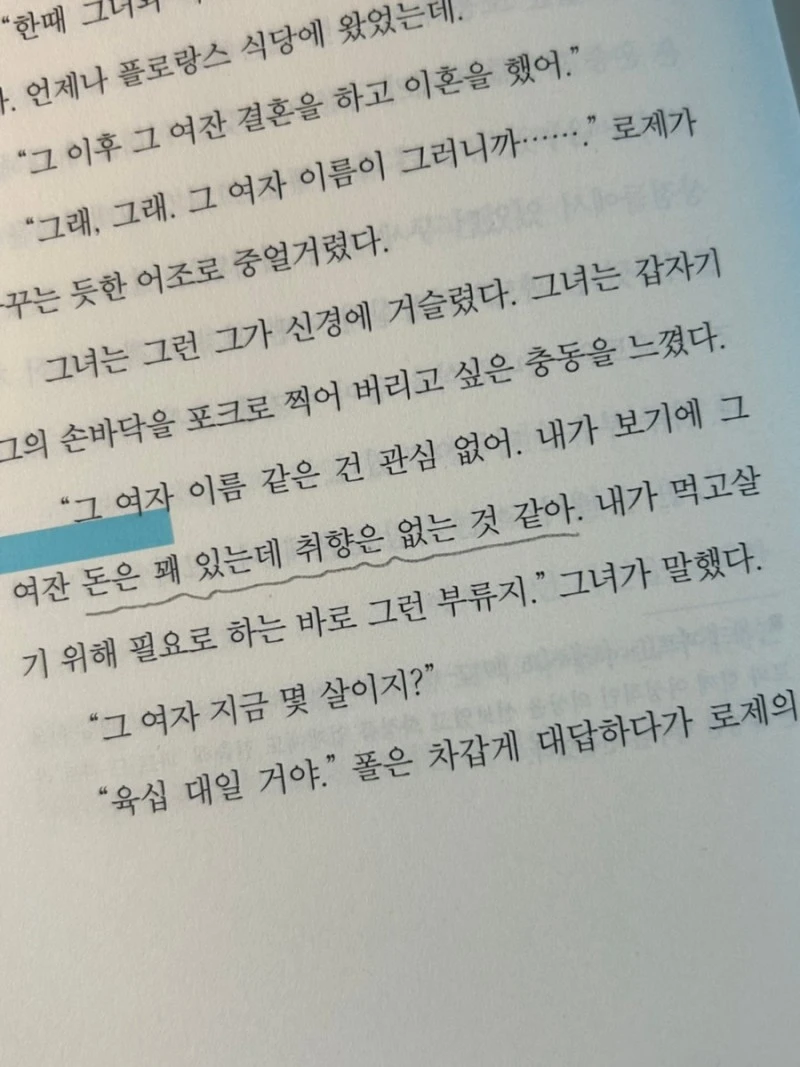 “요즈음 그녀는 책 한 권을 읽은데 엿새가 걸렸고, 어디까지 읽었는지 해당 페이지를 잊곤 했으며, 음악과는 아예 담을 쌓고 지냈다. 그녀의 집중력은 옷감의 견본이나 늘 부재중인 한 남자에게 향해 있을 뿐이었다. 그녀는 자아를 잃어버렸다. 자기 자신의 흔적을 잃어버렸고 결코 그것을 다시 찾을 수가 없었다. “브람스를 좋아하세요?” 그녀는 열린 창 앞에서 눈부신 햇빛을 받으며 잠시 서 있었다. 그러자 “브라스를 좋아하세요”라는 그 짧은 질문이 그녀에게는 갑자기 거대한 망각 덩어리를, 다시 말해 그녀가 잊고 있던 모든 것, 의도적으로 피하고 있던 모든 질문을 환기시키는 것처럼 여겨졌다. “브람스를 좋아하세요?” 자기 자신 이외의 것, 자기 생활 너머의 것을 좋아할 여유를 그녀가 아직도 갖고 있기는 할까?”