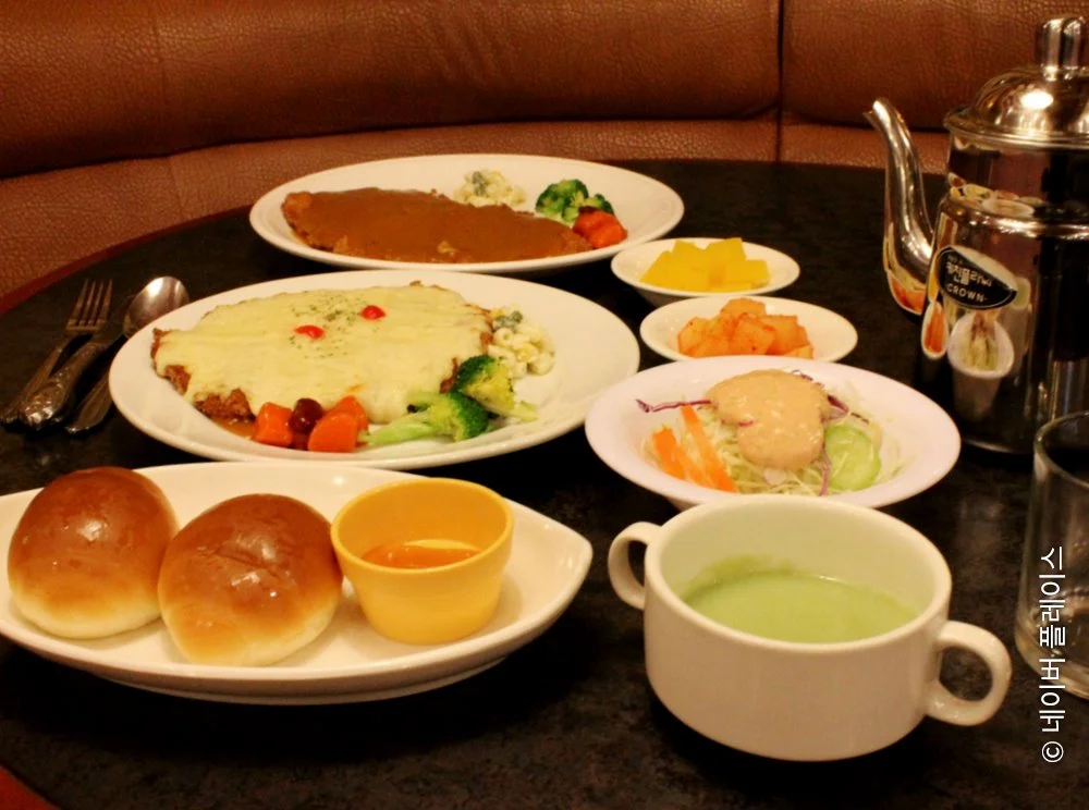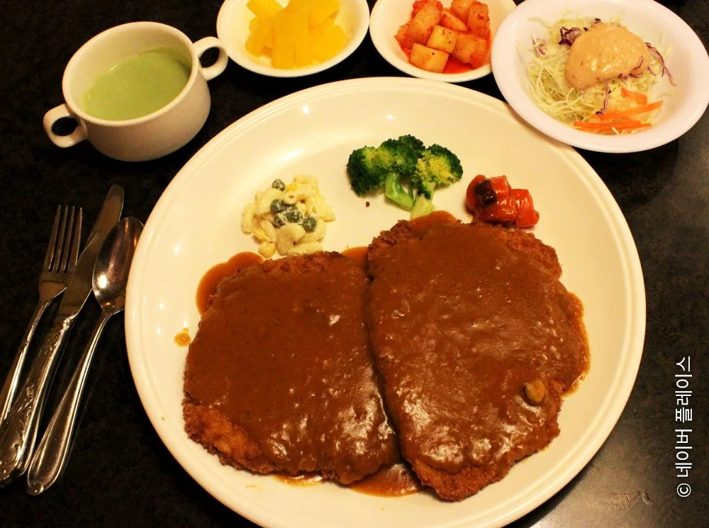 · 1980년대 전통소스를 부먹한 돈가스로 스프, 깍두기, 단무지, 양배추 샐러드, 탄산음료가 무한 리필