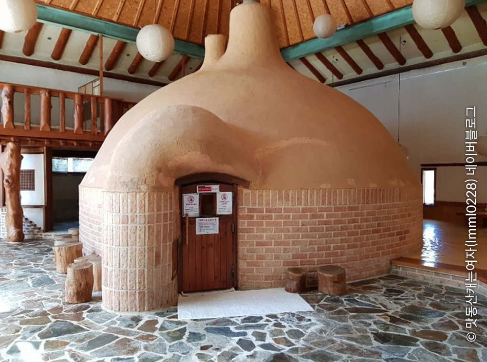 · 시골 할머니 댁을 연상시키는 황토 한옥의 돔 모양 한증막에서 즐기는 찜질