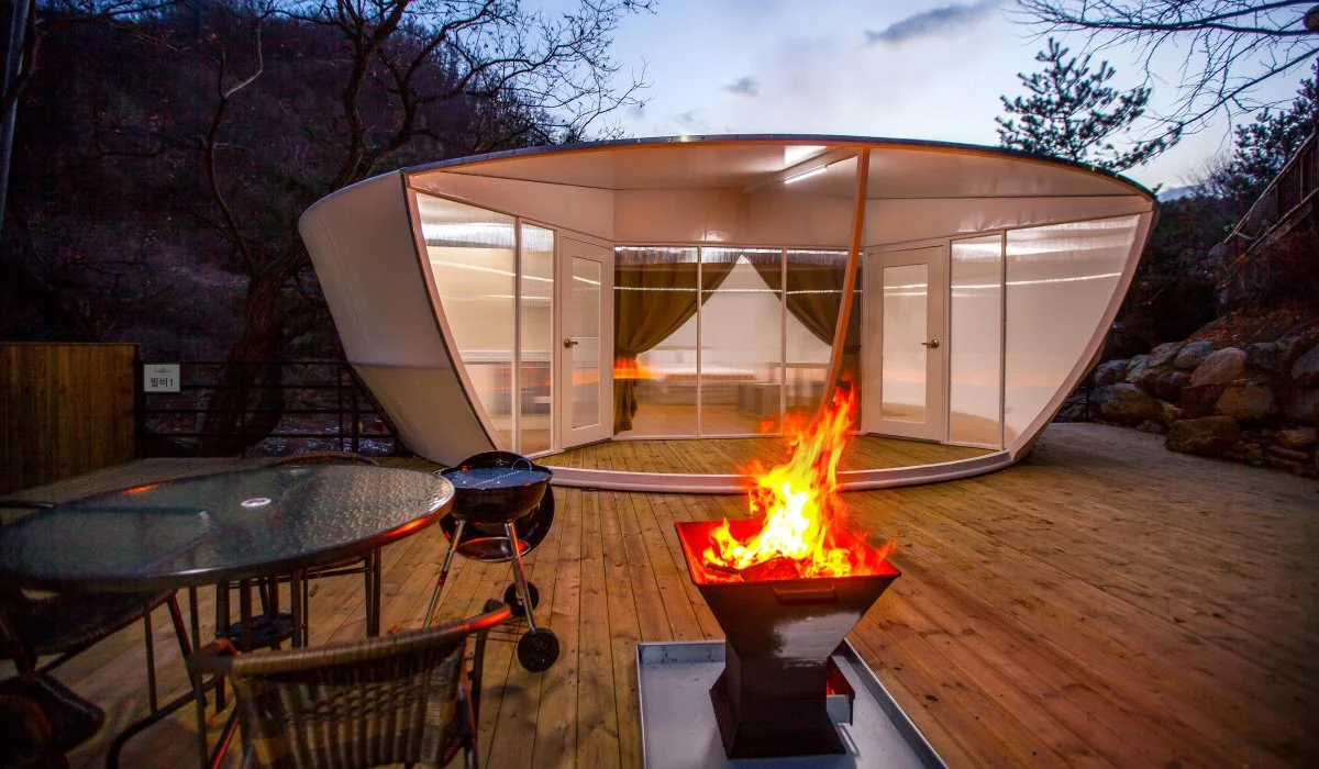 UFO 혹은 외국의 현대건축물 같은 백색의 날렵한 외형이 매력적인 글램핑 텐트. 가평의 파인 포레스트는 자연과 어우러지는 아름다운 텐트 속에서 아늑한 내부 공간과 캠핑의 열린 느낌을 함께 즐길 수 있는 글램핑 공간이다. 객실 내부에는 취사도구 및 주방시설이 갖춰져 있어 음식을 조리하기 편리하다. 야외 테라스에서 바비큐와 다양한 놀이를 즐기며 자연 속에서 평온한 하룻밤을 보낼 수 있다. 원룸형과 복층형 등 다양한 형태의 객실이 준비되어 있으니 취향대로 골라보자.