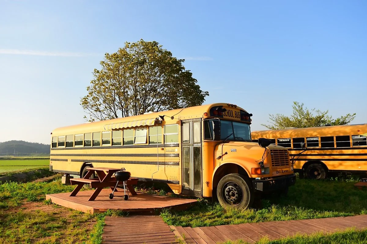 실제 미국에서 운영했던 스쿨버스를 리빌딩한 이색 캠핑장. 미국의 주 이름이 붙은 10대의 노란색 스쿨버스가 이국적이다. 보통의 카라반보다 넓은 내부가 특징으로 주방과 욕실 공간도 넉넉하다. 캠핑카와 더불어 할당된 공간에는 개별 바비큐장이 있으며 추가로 텐트 설치도 가능하다. 안내실 겸 카페에서는 커피와 음료, 비상약품 등을 판매한다. 근처의 안면해수욕장까지는 걸어서 8분 거리로 원한다면 언제든 바다를 감상할 수 있다.