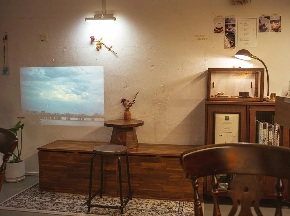 · 동네 모습이 담긴 필름 영사기 화면이 한 컷 한 컷 돌아가는 은은한 감성카페
