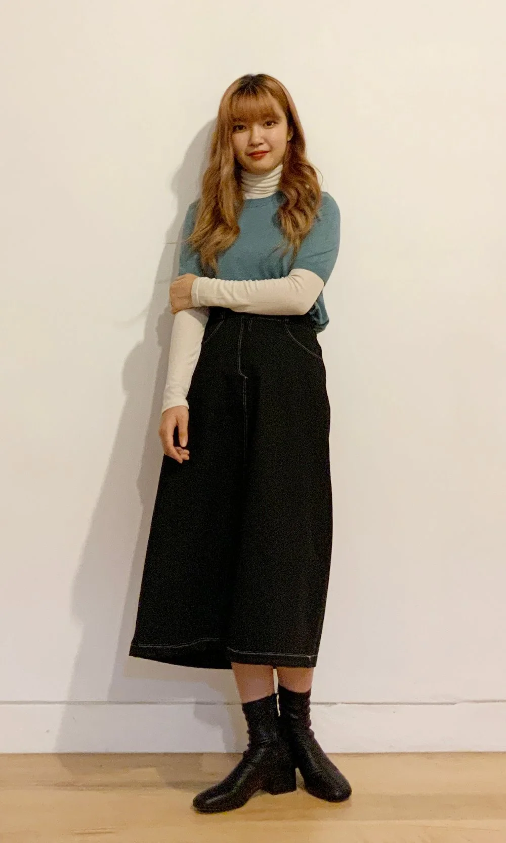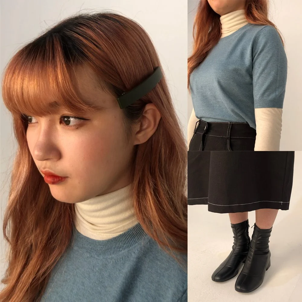카키색 헤어핀 + 화이트 목폴라 이너웨어 + 스카이블루 컬러 반팔 니트 셔츠 + 화이트 스티치 장식 롱 스커트 + 앵클부츠