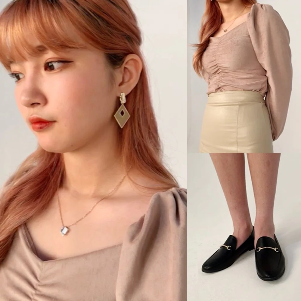 브이넥 펌프 숄더 핑크톤 블라우스 + 골드 컬러 가죽 스커트 + 단정한 단화 + 포인트 네크리스 + 스퀘어 이어링