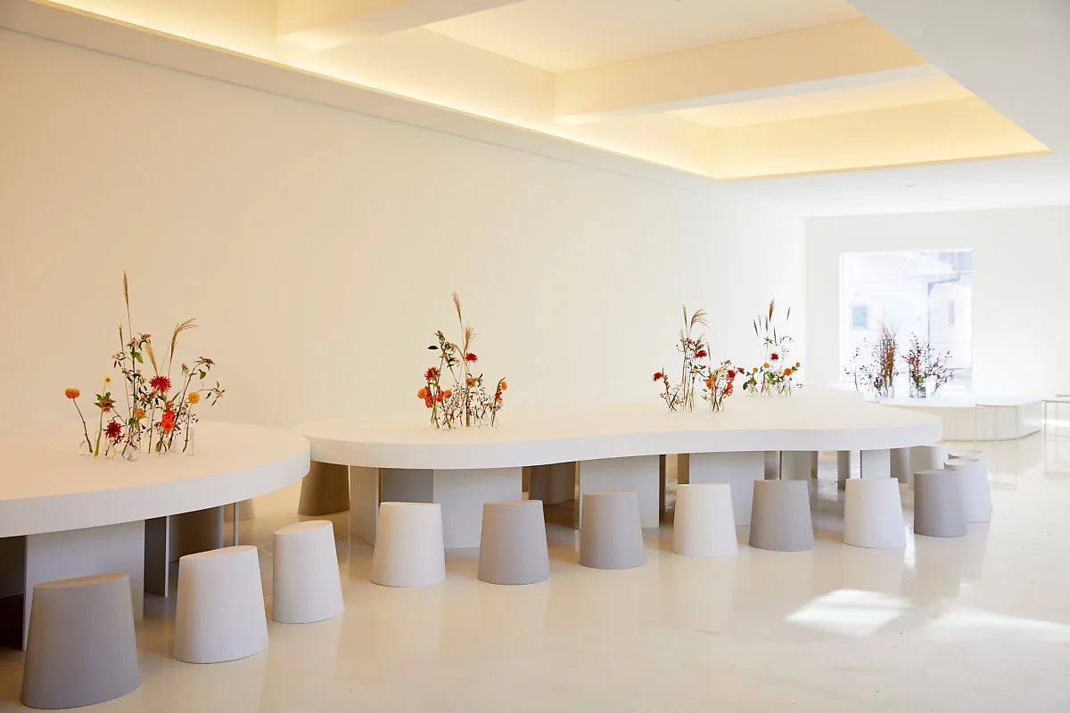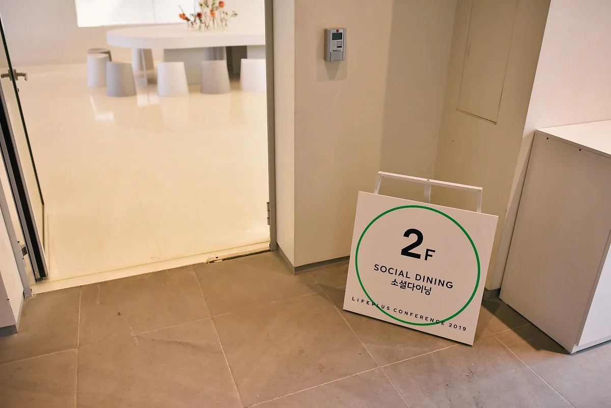 이제 자리를 옮겨 소셜 다이닝이 시작됩니다. 컨퍼런스 홀과는 또 다른 느낌이네요. 라이프플러스의 심볼을 구현한 거대한 테이블을 중심으로 계절감이 느껴지는 미니멀한 공간이 펼쳐집니다.