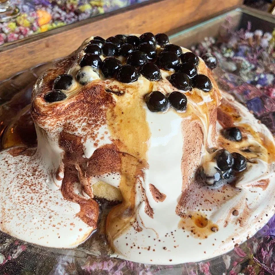 · 동그란 시폰 케이크 위로 펄과 흑당크림이 마치 폭포처럼 쏟아지는 비주얼