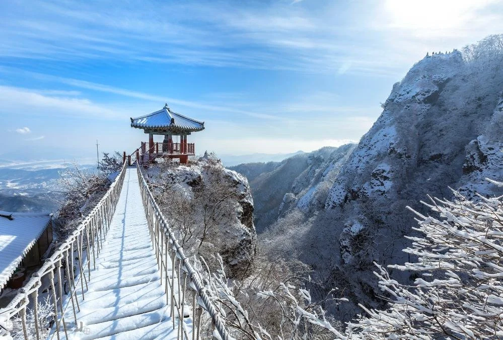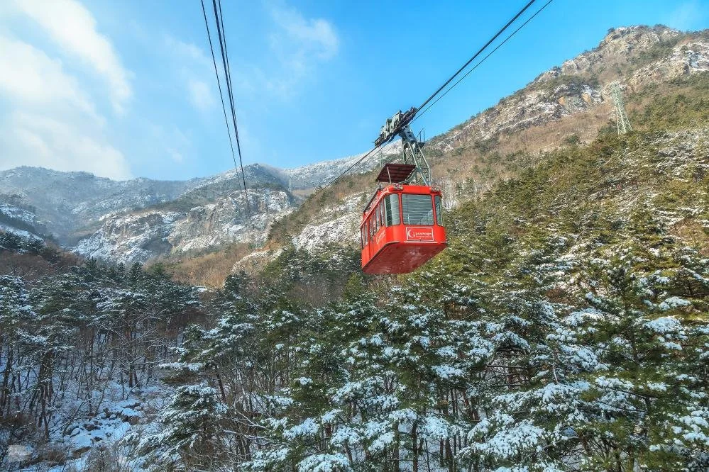 이국적인 분위기가 물씬 풍기는 빨간색 케이블카, 경북 구미의 명산 금오산에서 만날 수 있어요. 금오산은 1970년 한국 최초의 도립공원으로 지정된 산, 1974년 만들어진 케이블카를 타면 기암괴석과 계곡 폭포가 어우러진 아름다운 금오산의 경치를 구경할 수 있어요. 사계절이 아름다운 곳이지만 눈이 내리면 만날 수 있는 설경은 더욱 특별하답니다.