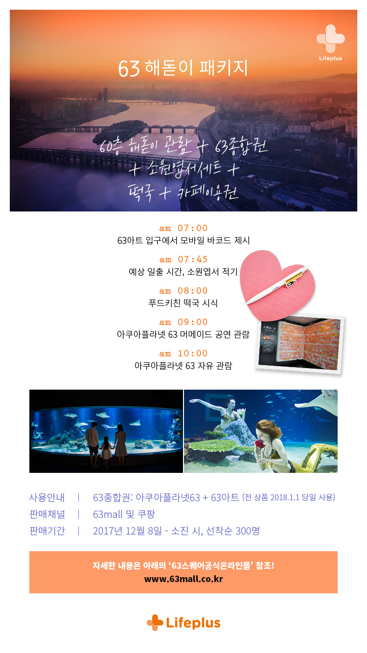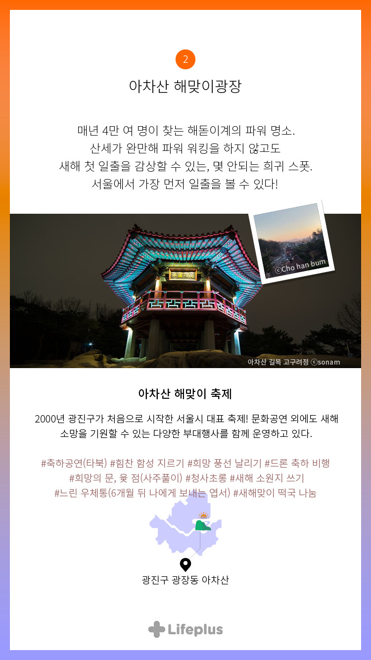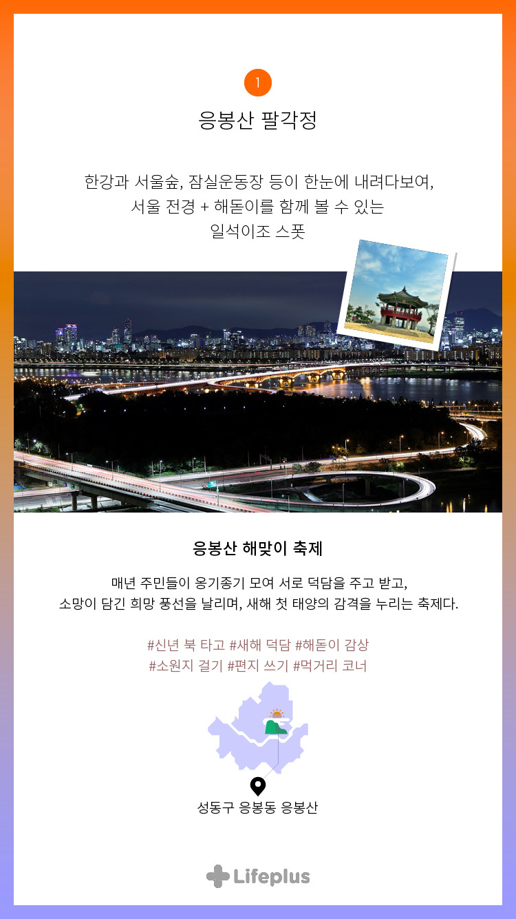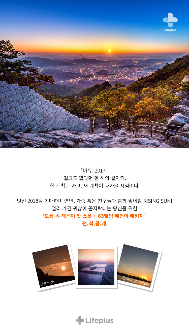안전한 이불 속도 좋지만 떠오르는 붉은 해를 기다리면서 한 해 동안 간직할 추억을 만들어보는 건 어떨까요? Lifeplus가 소개해드리는 20곳의 서울 해돋이 핫스폿, 그리고 63빌딩에서의 따뜻한 해맞이 '63 해돋이 패키지'에 도전해보세요~