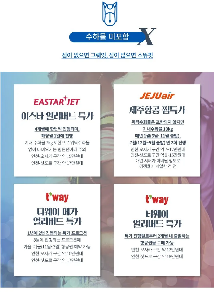 항공권 중 위탁수하물이 있는 특가가 있고 위탁수하물이 없는 특가가 있기 때문. 위탁 수하물 추가금액은 예매 시 추가 경우 + 약 5만원 이지만, 나중에 추가할 경우 +10만원이 되니 평소에 구매하는 가격과 비슷해져 특가 구매의 Benefit이 없어질 수 있다.